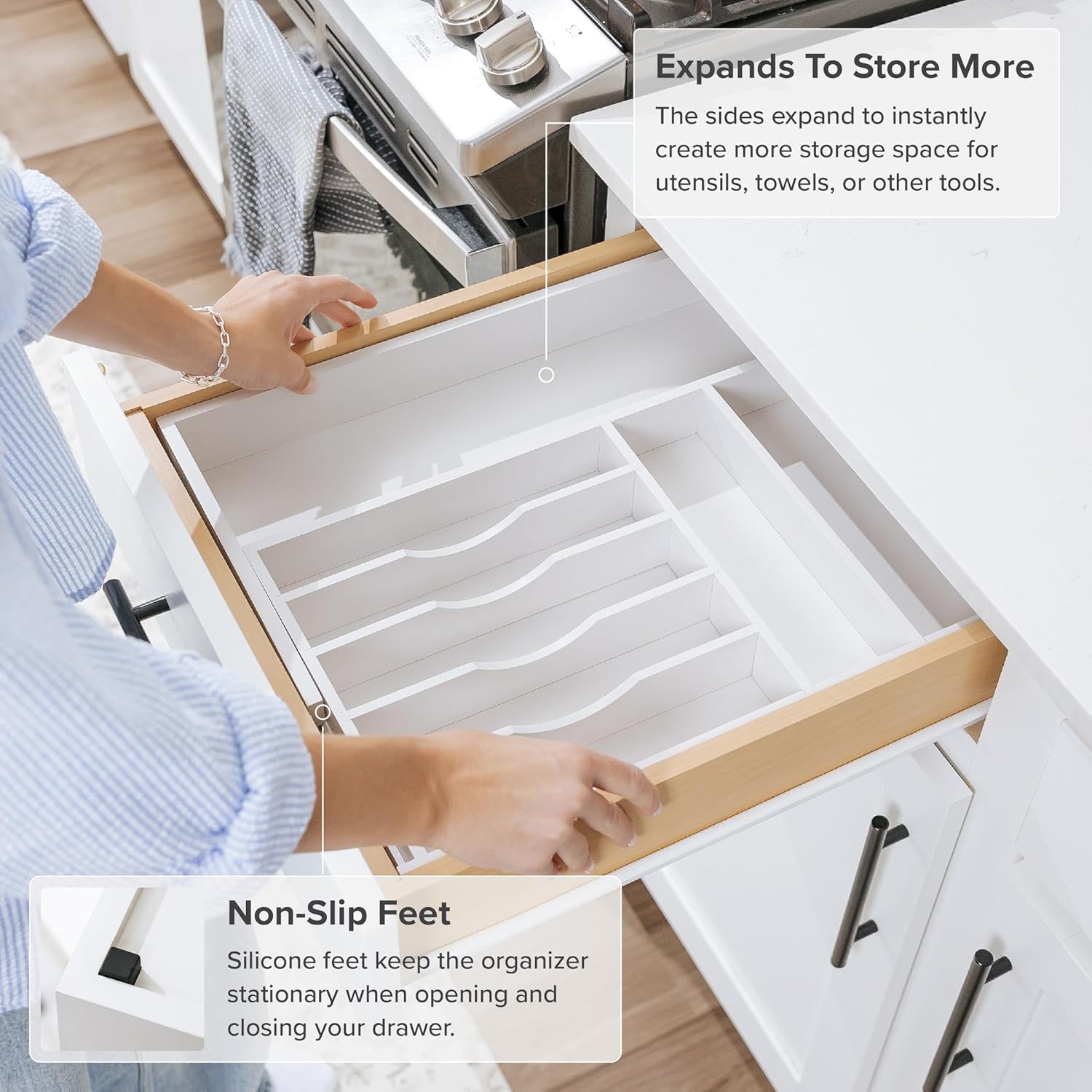 - ENHANCED DRAWER STORAGE: This 8-compartment (7 fixed + 1 adjustable) white organizer, measuring 17.4 inches in length and 2.7 inches tall, maximizes your smaller drawer’s storage potential. It expands from 11 inches to 19 inches in width, accommodating any width in between. Unlike most bamboo organizers that maintain a 2-inch height, the additional 0.7” in height remarkably amplifies storage capacity when filling the organizer with flatware and utensils.