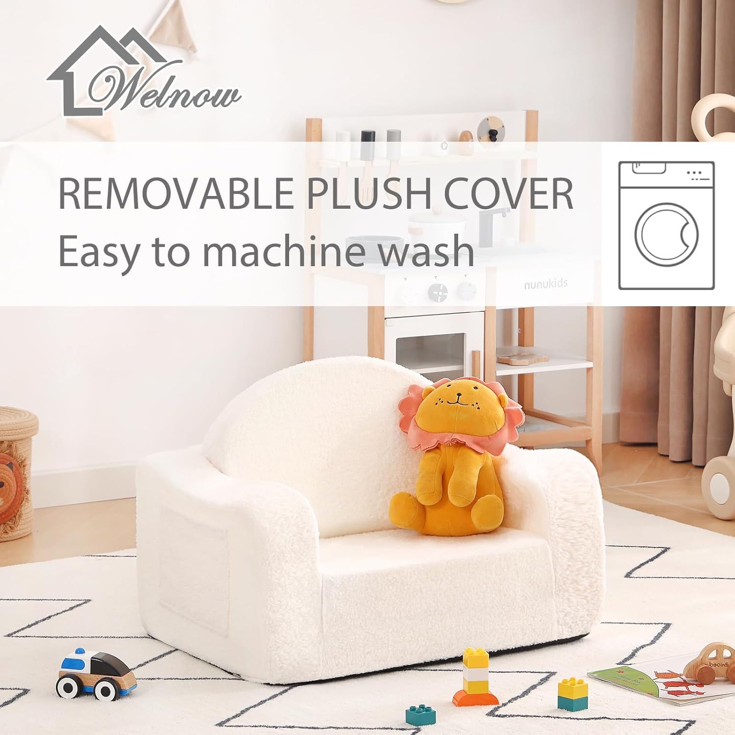 Welnow 2-in-1 Kids Sofa Chair, Convertible Toddler Chair Flip Out Children Sofa Chair with Wave Armrests Folding Kids Play Sofa with Side Pockets & Removable Cover Armchair for Girl or Boy