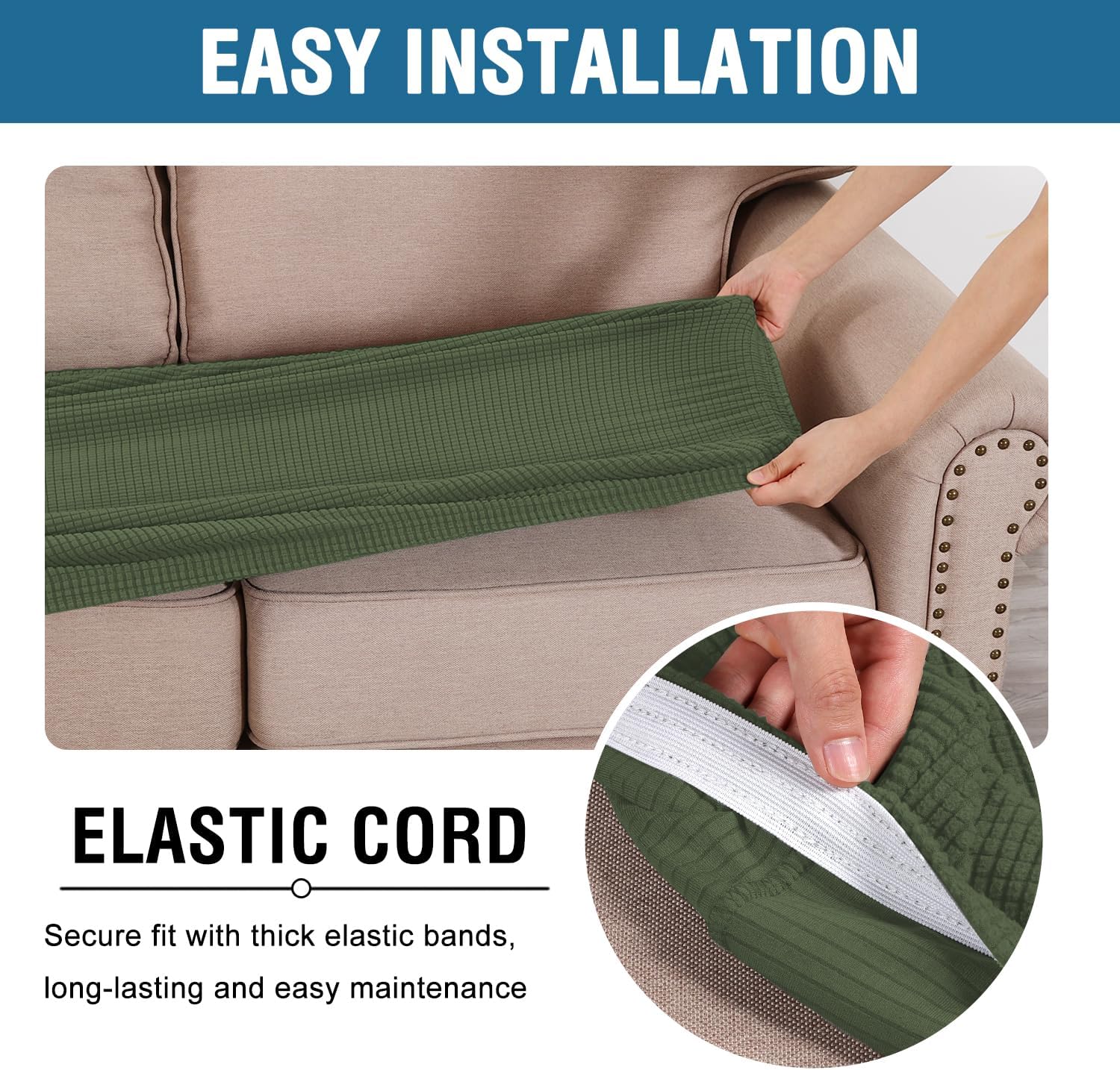 - NON SLIP: Effortless for installation (guide photos on selling page), sewn with thick elastic loops to cover the bottom edges. It is easy to install and take off, making your home more harmony, high recommended for both leather and cloth furniture