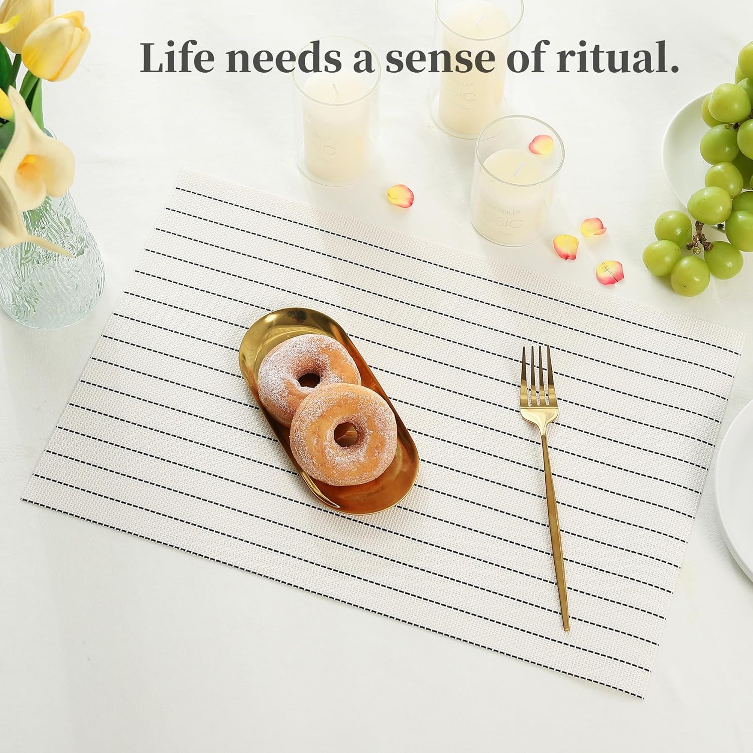 Leetaltree White with Black Stripes Placemats Set of 6 - Heat Resistant Non-Slip Place mats for Dining Table, Washable Durable PVC Vinyl Woven Table Mats(White Stripes, 6)
