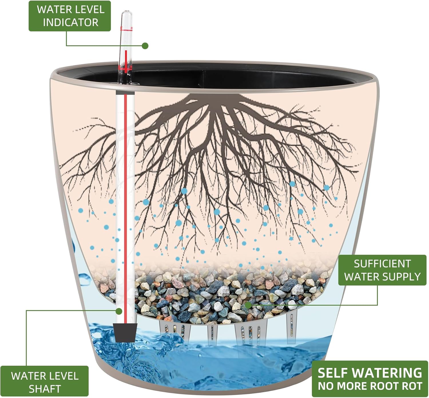 - SELF WATERING & NO MORE ROOT ROT - The smart unique sub-irrigation system is one of the most appealing aspects among all Dexceder planters. The easy-to-use separated integrated water reservoir or catcher- keeps your soil well aerated and automatic supplies plants with the right amount of ongoing moist air & nutrition for optimal growth. The insert indicator shows you the exact time to water again. The full water supply period can single-handedly last over 3 weeks based on different live plants