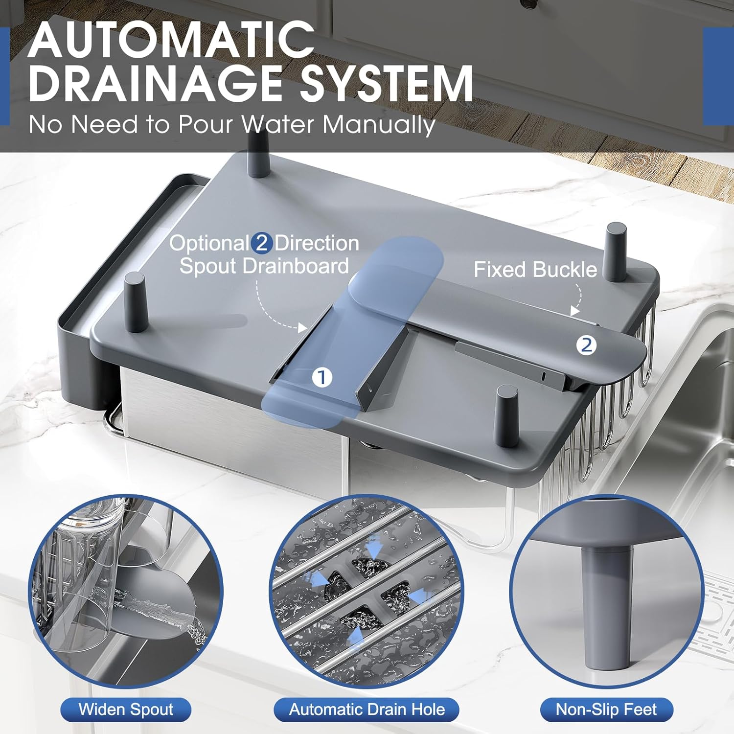 - Adjustable Drainer for Any Countertop: Flip the dish drainerβs spout left/right in seconds! Works with side-by-side sinks, corners, or tight spaces. Water flows straight into your sink β no messy kitchen counter dish drainers here!