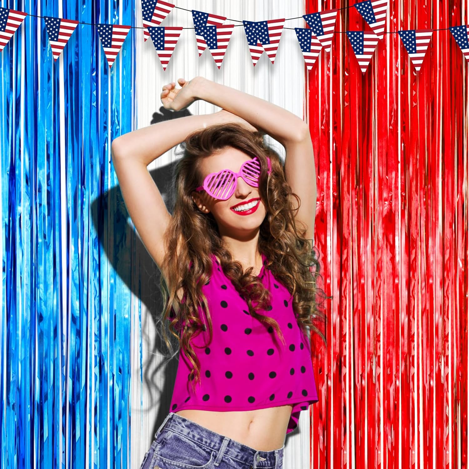 - Premium Material: This Red White and Blue foil curtain backdrop is made of stable tinsel, non-fading, stay shiny and reusable. Unfold it and then enjoy your glittering party