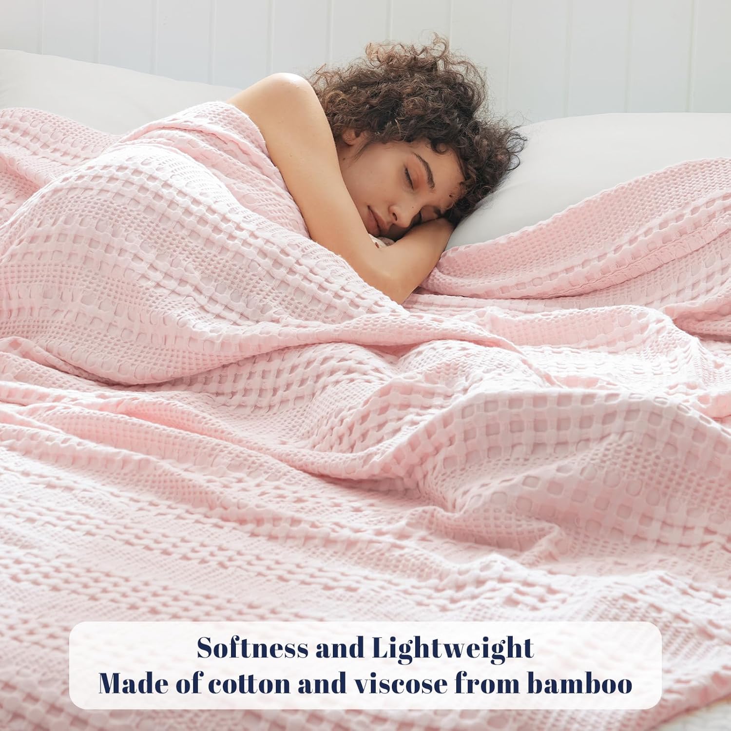 PHF Cooling Waffle Blanket Queen Size, Lightweight 60% Rayon Derived from Bamboo & 40% Cotton Breathable Blanket for Hot Sleepers, Soft and Luxury for Bed Couch and Sofa, 90"x90", Pink