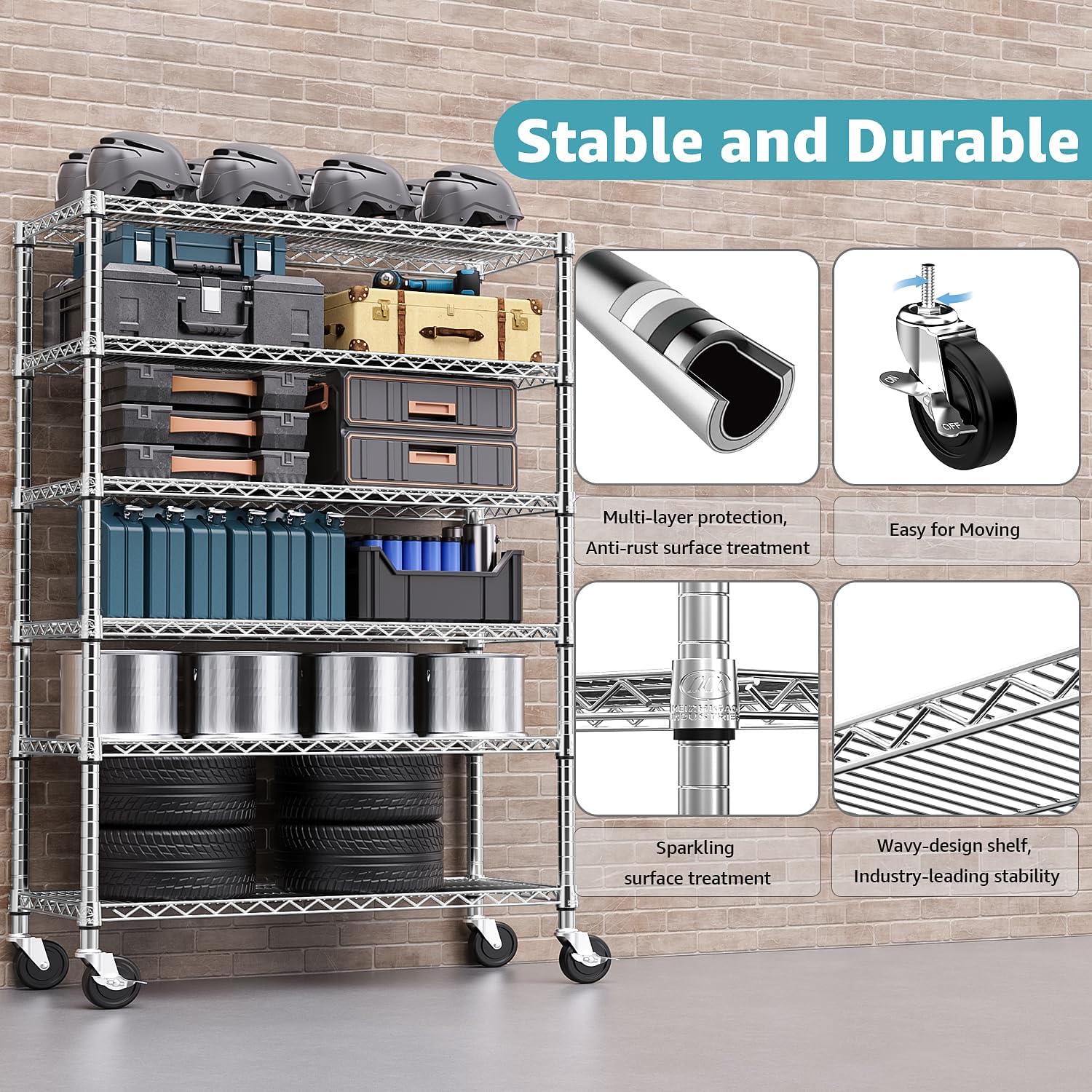 Steel Storage Shelving 6-Tier Utility Shelving Unit with Wheels, Steel Organizer Wire Rack for Home,Kitchen,Office,Garage,17.7" D x 47.2" W x 76.7" H
