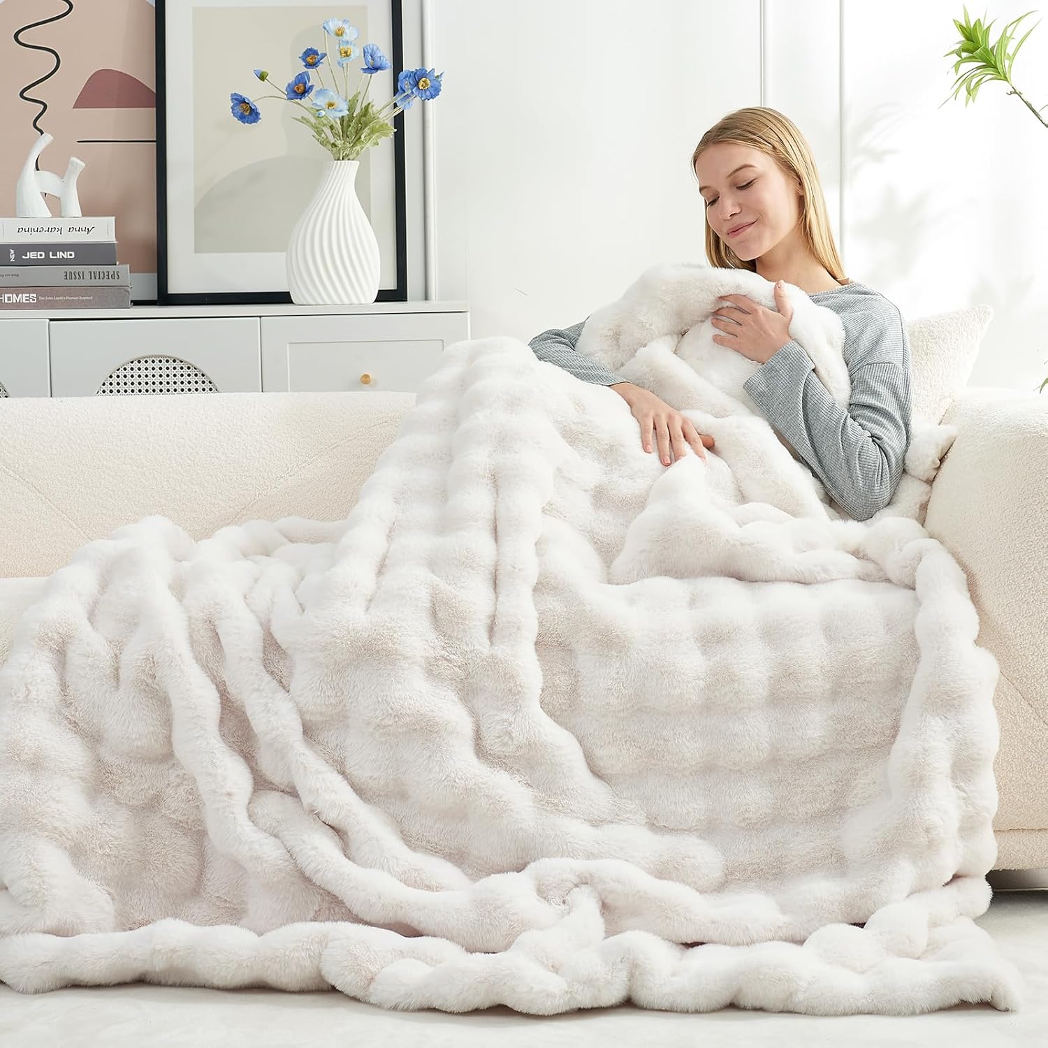 Cozy Bliss Faux Fur Throw Blanket for Couch, Fuzzy Soft Plush Thick Bubble Blanket for Sofa Bedroom Living Room, 60 * 80 Inches Cream White