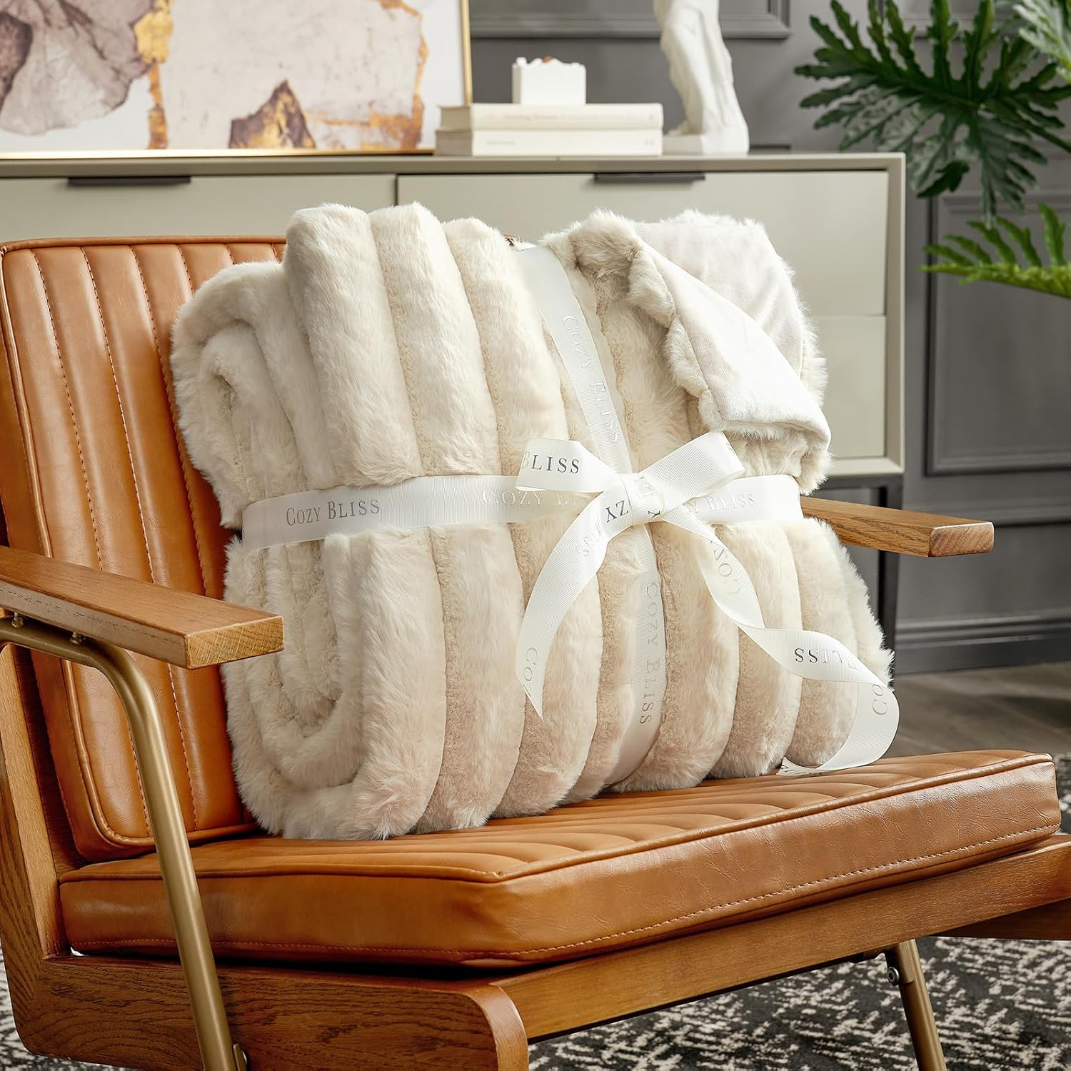 Cozy Bliss Faux Fur Throw Blanket for Couch, Cozy Warm Plush Striped Blanket for Sofa Bedroom Living Room,50 * 60 Inches Beige