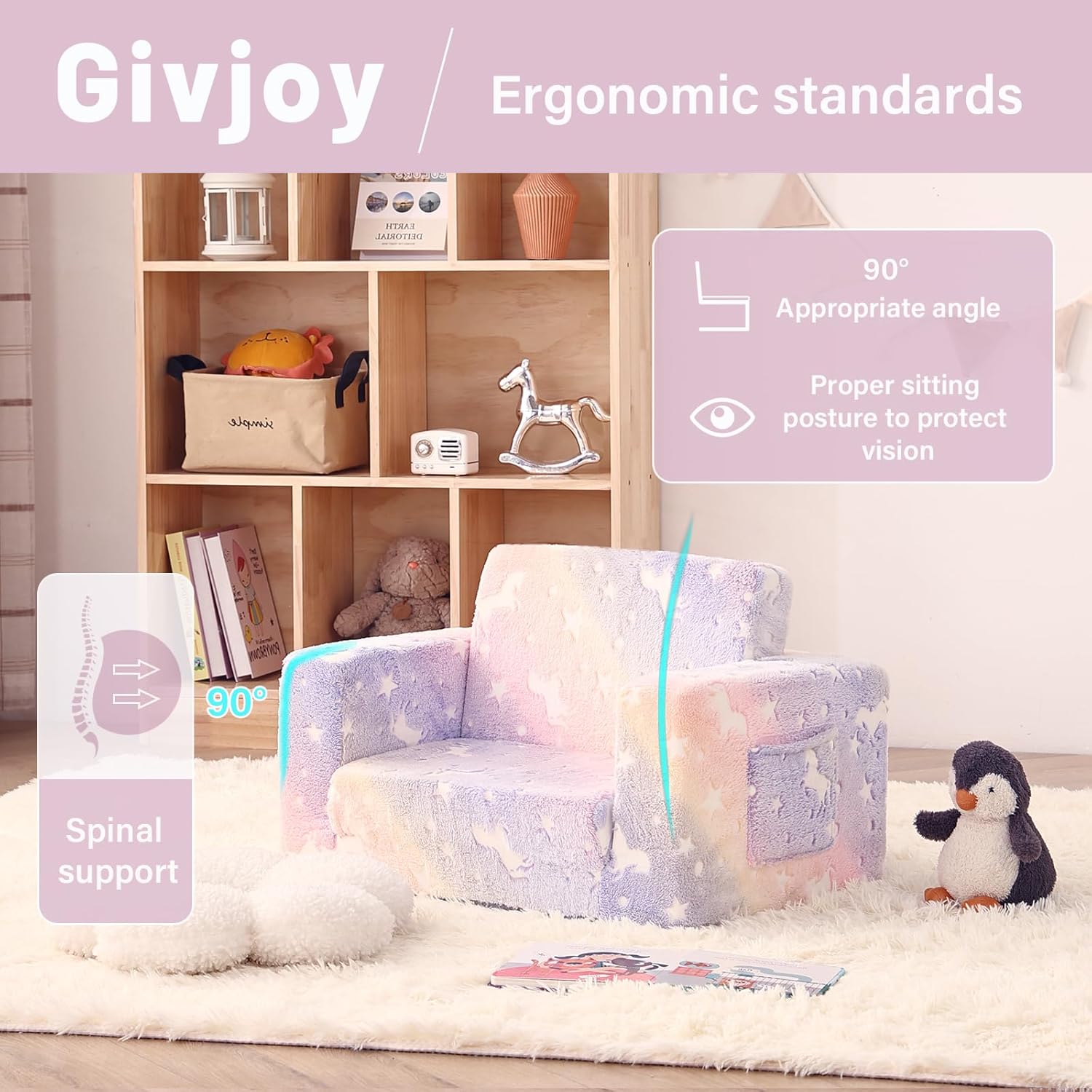 Toddler Chair Kids Couch, 2-in-1 Toddler Soft Sherpa Couch Fold Out Armchair with Removable Cover, Convertible Reading Chair Toddler Sofa for Kids, Glow in The Dark Purple Horse