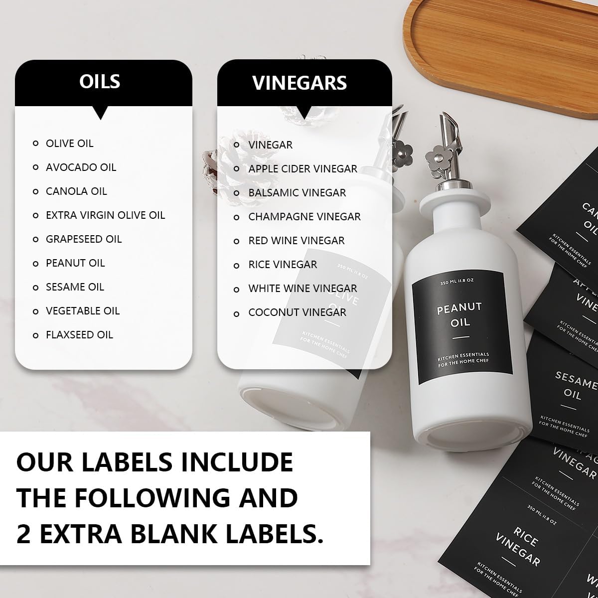 - KITCHEN OLIVE OIL DISPENSER BOTTLES – The oil and vinegar dispenser set contains 2 white 11.8oz (350ML) glass bottles, 2 silver stainless steel oil spouts, 17 waterproof labels(kinds of oil and vinegar) and a bamboo tray, Ideal for safely store and dispense your olive oil and vinegar.