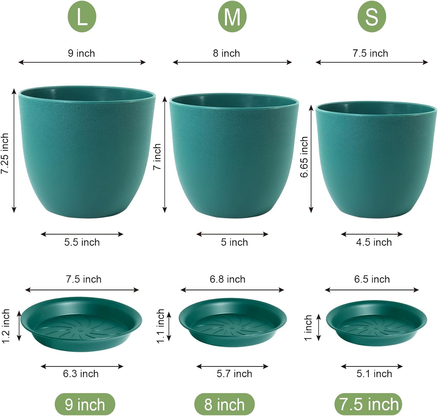 9/8/7.5 inch Flower Pots, 3 Pack Modern Plastic Planters with Drainage Holes and Trays for House Plants, Plant Pots for Indoor Outdoor Plants, Blue Green