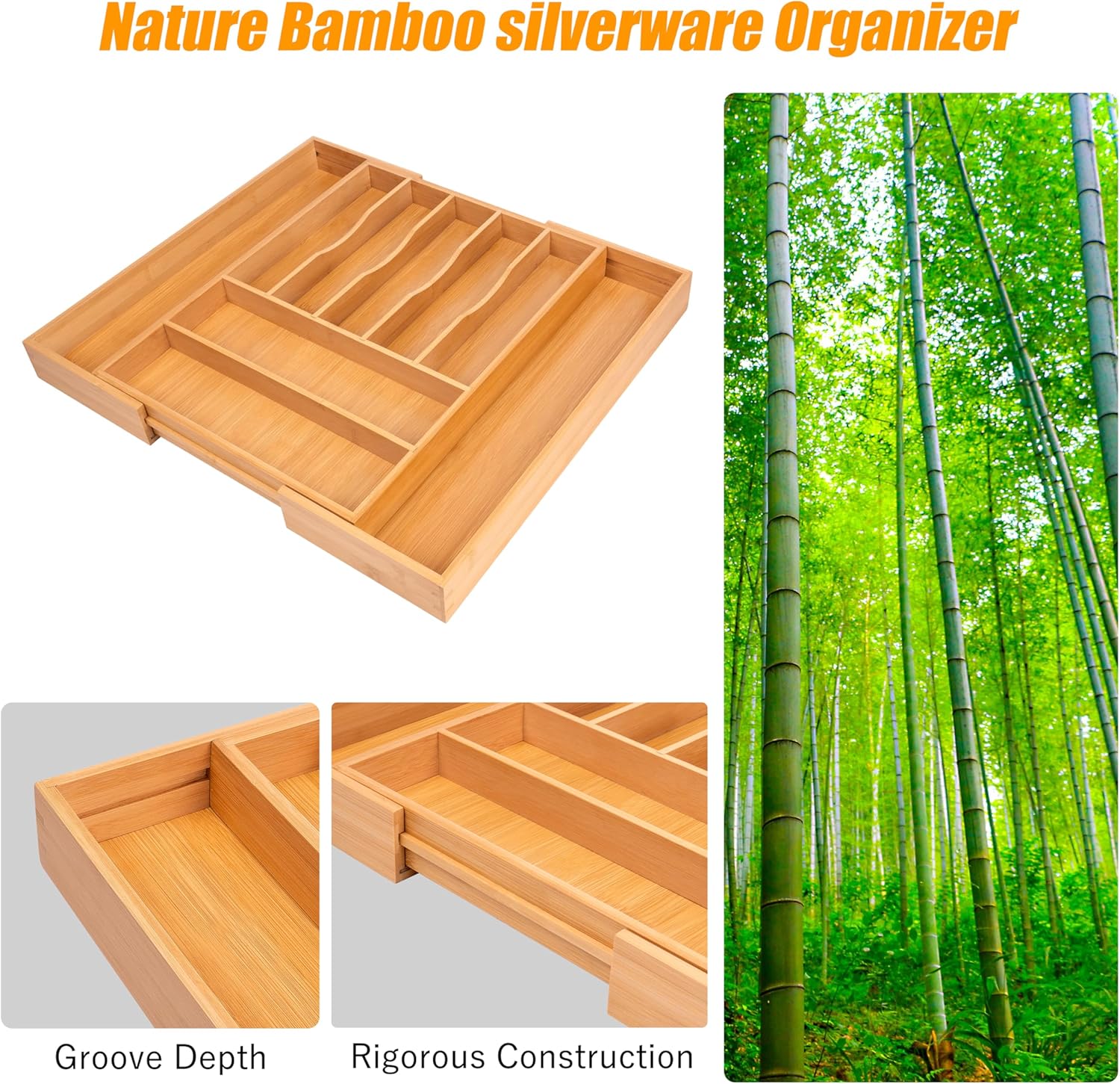 - â ăExpandable - fit most kitchen drawers.ăOur large utensil silverware drawer organizer flatware cutlery tray are adjustable in width, expanding from 17"x13" to 17"x19.6" as needed, with a depth of 1.9" . The utensil silverware drawer organizer is crafted from natural bamboo that has been grown for over 4 years. Each silverware drawer organizer made of bamboo is meticulously handcrafted by seasoned artisans to ensure a smooth, smooth surface. You can confidently allow your family or children to use our silverware drawer organizer.