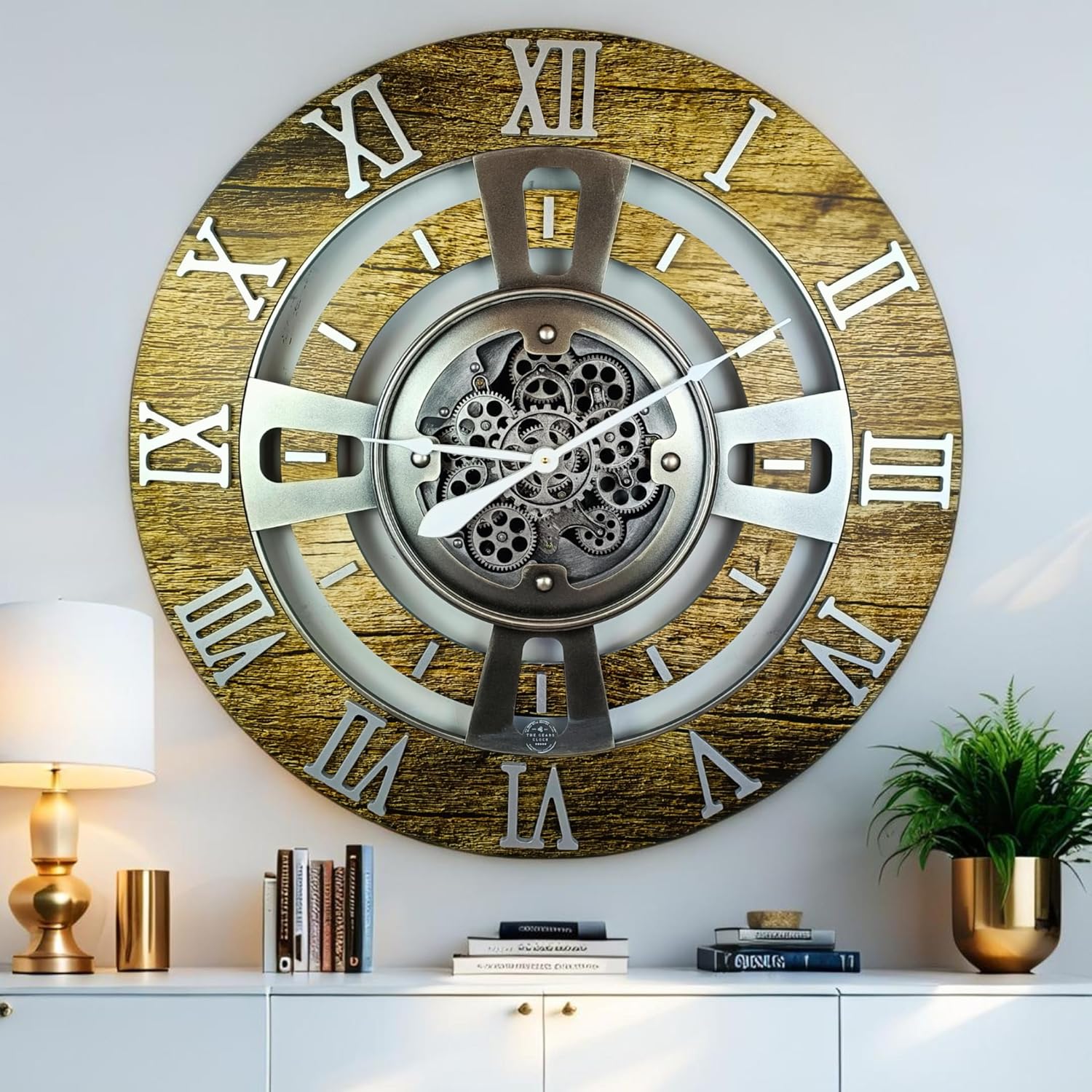 - MATERIAL QUALITY | The entire frame is made of Fir Wood, with embossed Silver Metal Numeral, and high Quality Plastic Silver with aged effect gears for vintage and industrial effect. Very Strong personality.