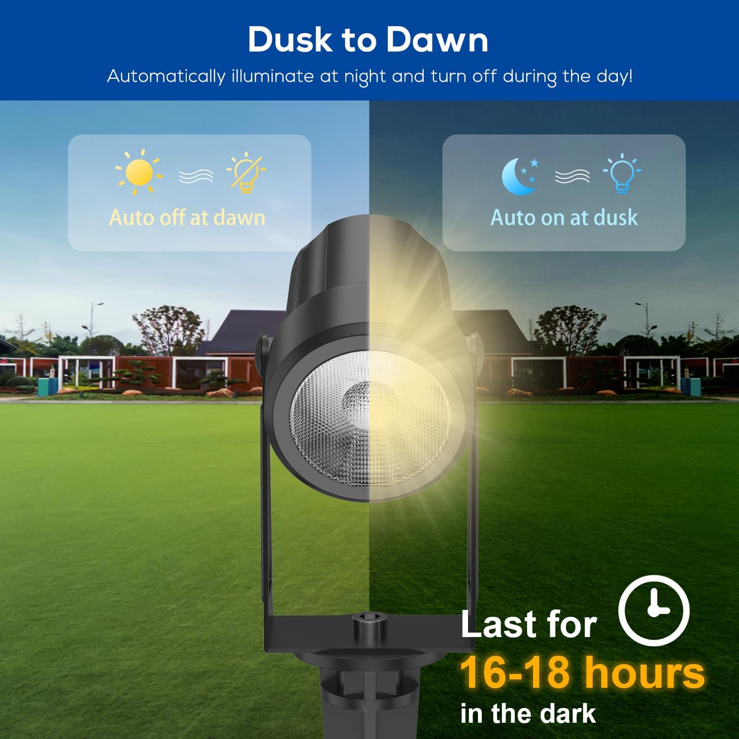- 【𝗔𝘂𝘁𝗼𝗺𝗮𝘁𝗶𝗰 𝗢𝗻/𝗢𝗳𝗳 & Adjustable Length】Equipped with Light Sensors, outdoor solar powered spot lights for yard garden automatically Turn On at Dusk and Off at Dawn. No need for manual operation, providing convenience and peace of mind. Featuring a warm 2700K color temperature and 100 lumens brightness, they deliver cozy yet effective illumination. Providing an optional 13FT (2x6.5ft) Extension Cable (Sold Separately, ASIN: B0D174SZZ3).