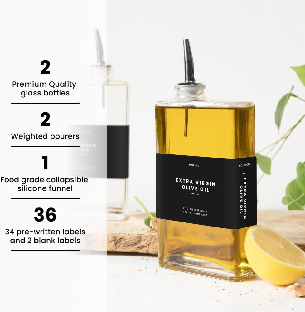 - Modern Kitchen Essential: Minimalism Inspired Cooking Oil Dispenser Bottle. This Set Includes Two High-quality 11.8 Oz (350 Ml) Glass Bottles, Two Gold Pourers, a funnel, and a 37 Label Set.