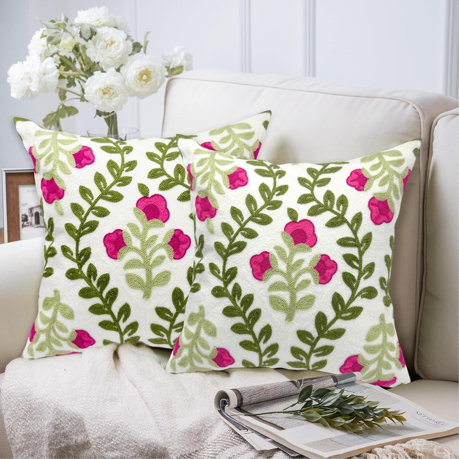 Alysheer Floral Embroidered Summer Decorative Throw Pillow Covers 20"x 20" Set of 2, Farmhouse Cottage Hot Pink Flowers Green Leaves Knit Pattern Cotton Canvas Cushion Case for Couch Bed Living Room