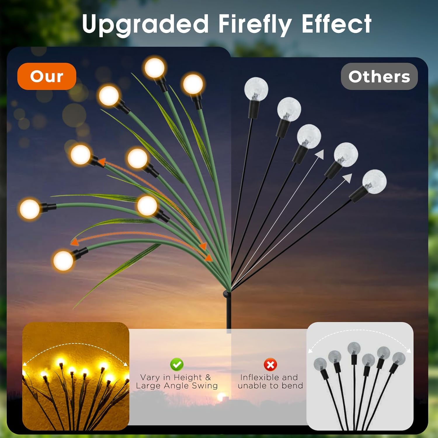 - Waterprood and Widely Use: outdoor IP65 waterproof firefly lights, made of high-quality materials, waterproof, freeze-proof, all our products are strictly tested for resistance and vibration before leaving the factory to ensure that they are long lasting. You can use the solar garden decor anywhere, such as gardens, lawns, courtyards, paths, as well as Christmas, weddings, New Year, parties, etc. No need to worry about rain, snow or bad weather.