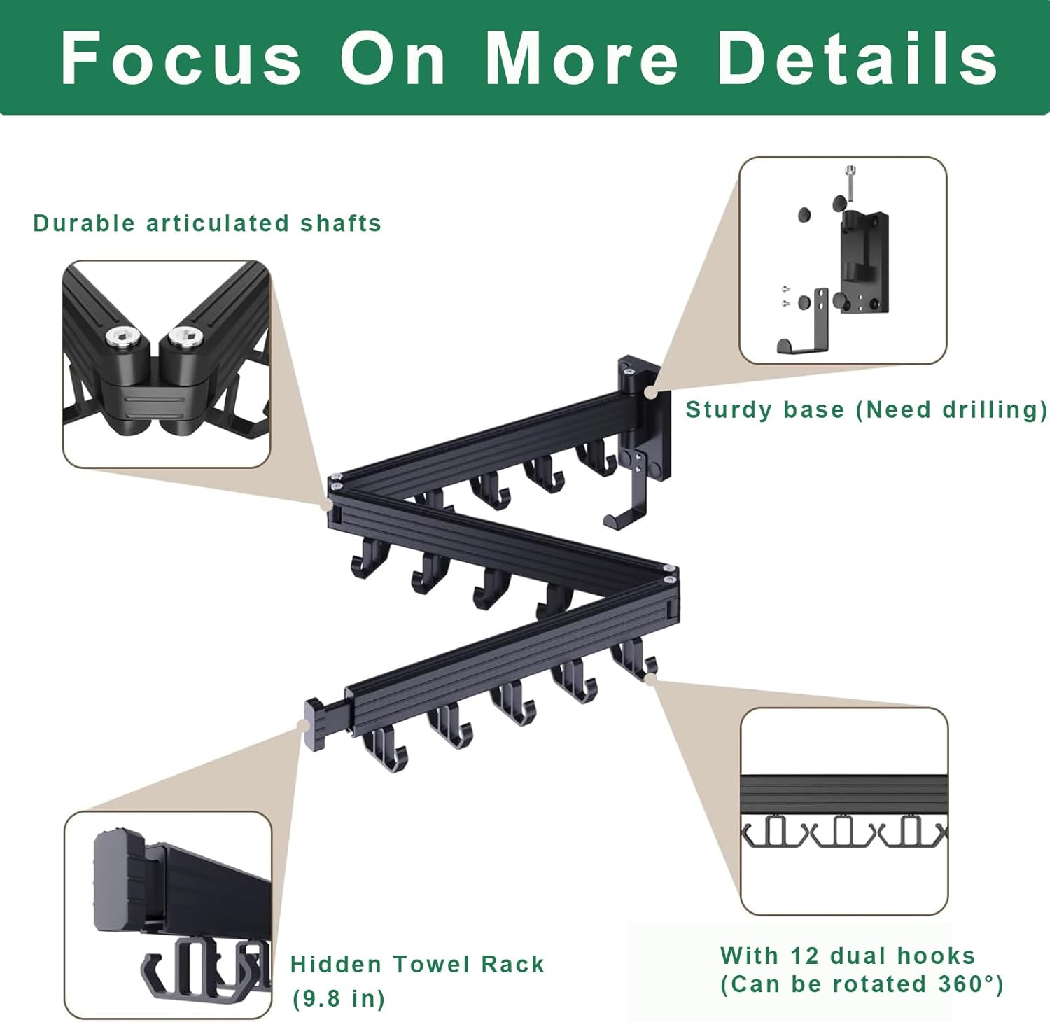 - β Upgrade Dual-J-Shape Hooks Design -- Our clothes drying rack features an innovative design with 12 dual J-shaped & circular hooks, providing you with versatile hanging options. The additional large hooks and extendable rods make it easy to hang a variety of items with ease. Maybe you will fancy this wall-mounted clothes rack, as it brings convenience and efficiency to your daily life.