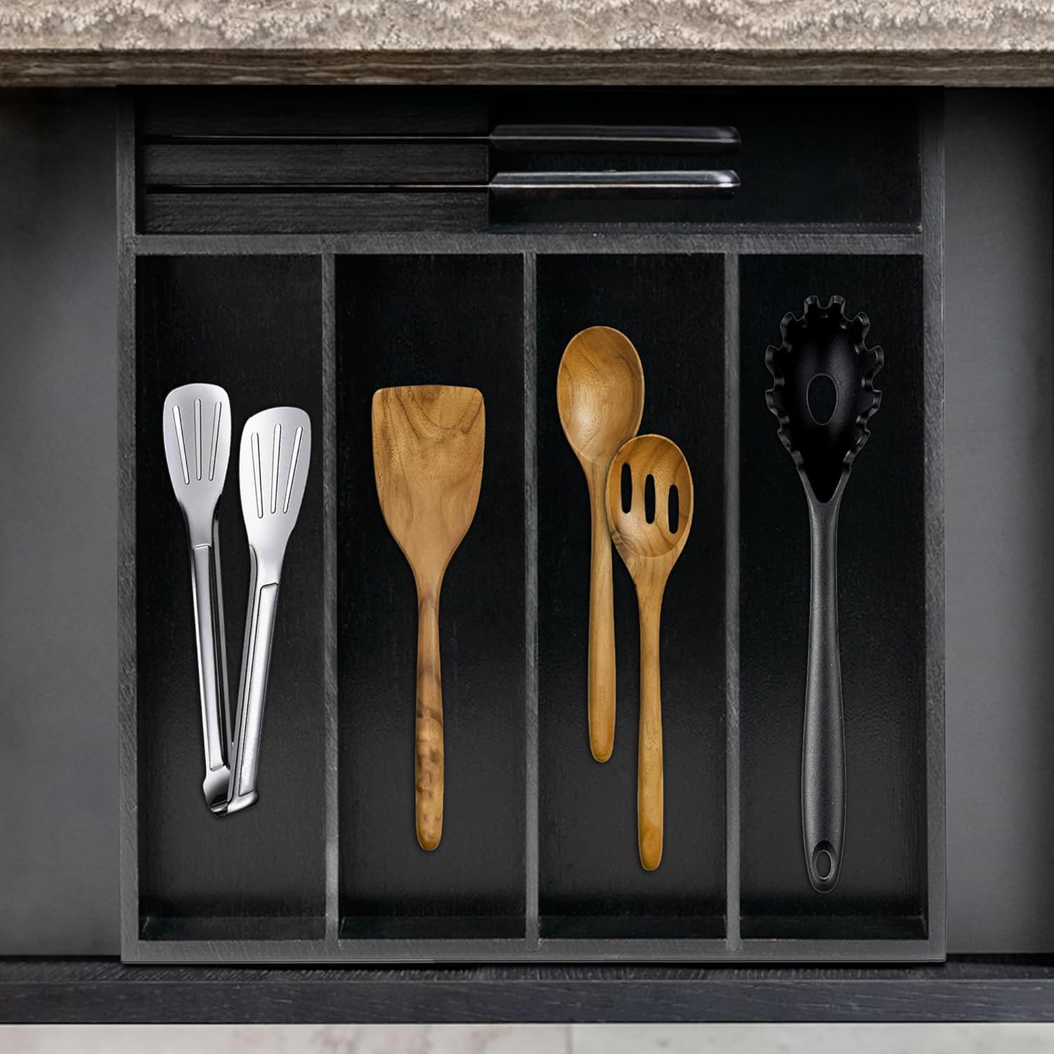 - Upgrade Your Kitchen Display: Hold your kitchen utensils, knives, spatulas, spoons and forks invisible in drawer; This wood silverware drawer organizer has 5 large compartments and a removable knife block