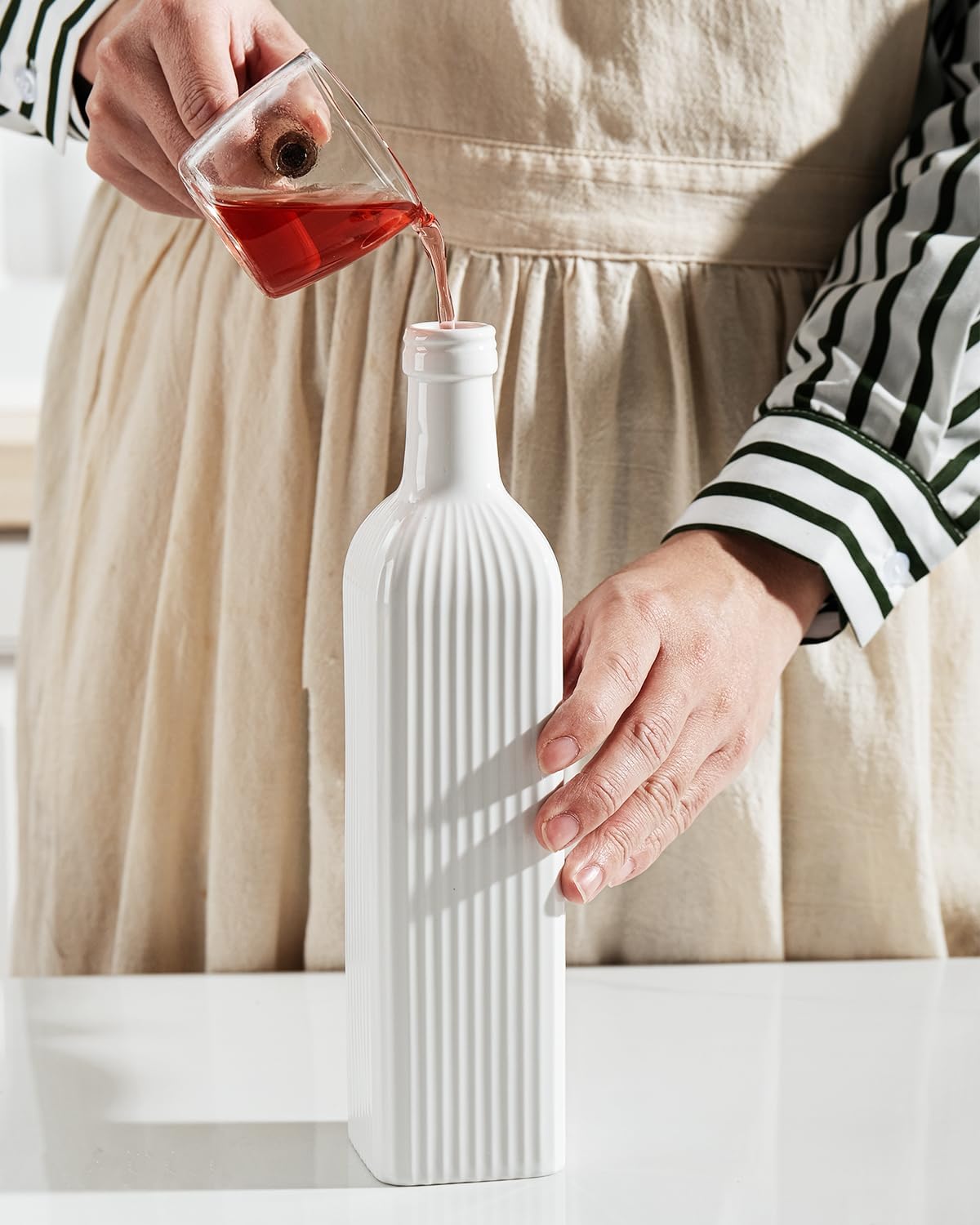- [Elegant Design] A sleek white ceramic cooking oil dispenser with embossed stripes, creating a visually appealing and tactile experience for your kitchen or dining table
