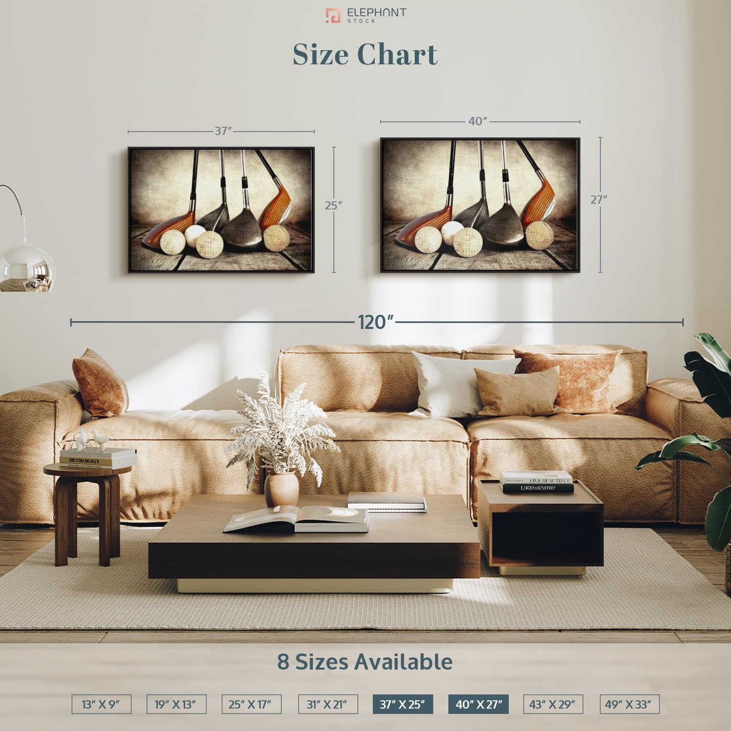 Elephant Stock Golf Sets Wall Art - Horizontal Framed Canvas - 1-Piece Mancave Wall Decor - Photography Sports Canvas Print - Yellow and Brown Decor for Wall - 40" X 27"