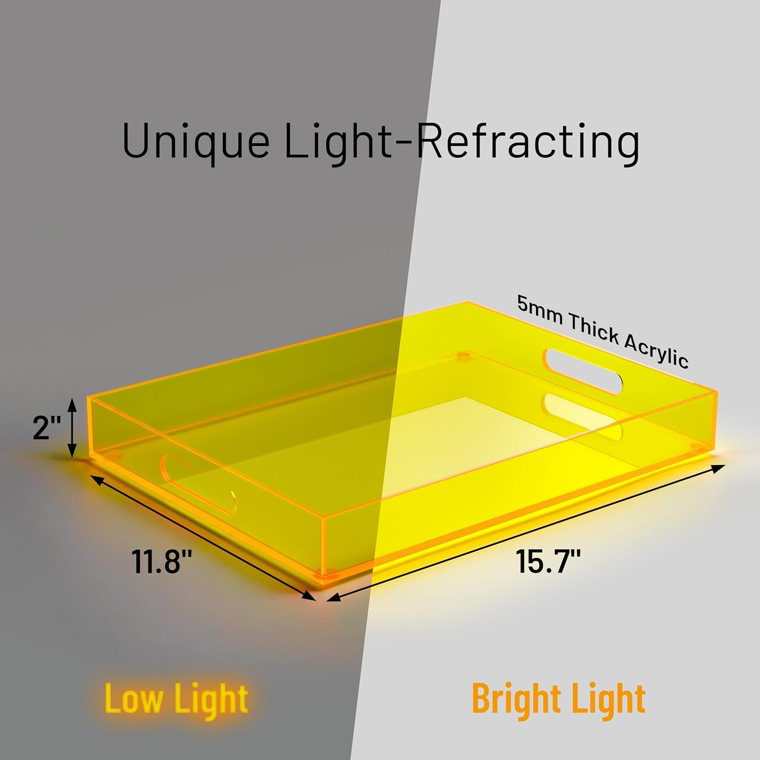 Large Acrylic Serving Tray Decorative Ottoman Coffee Table Vanity Tray Tea Fruit Platter Snack Appetizer Dessert Drink with Handles for Bar Kitchen Party, Neon Yellow