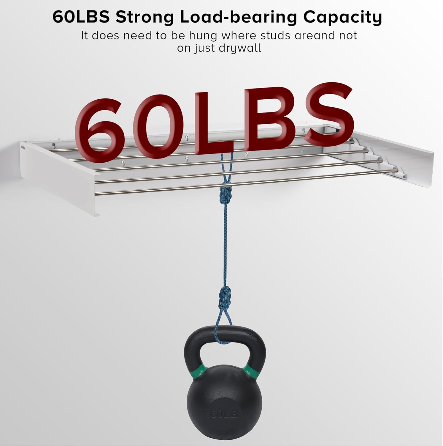 Wall Mounted Laundry Drying Rack, Retractable Clothes Drying Rack for Bathroom with Wall Template, 5 Stainless Rods Heaving 60 lb Capacity (White, 40")