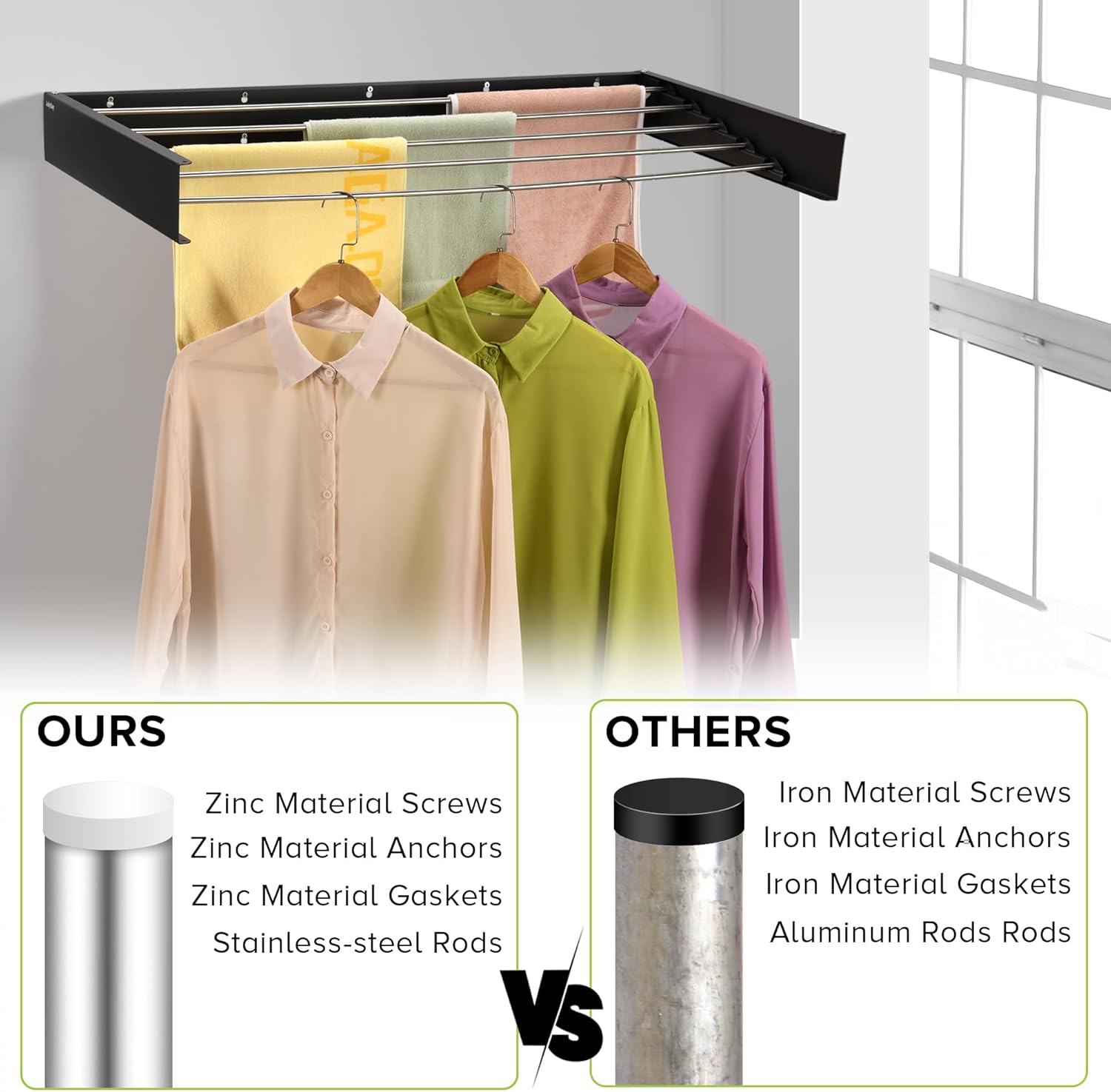 Wall Mounted Laundry Drying Rack, Retractable Clothes Drying Rack for Bathroom with Wall Template, 5 Stainless Rods Heaving 60 lb Capacity (Black, 40")