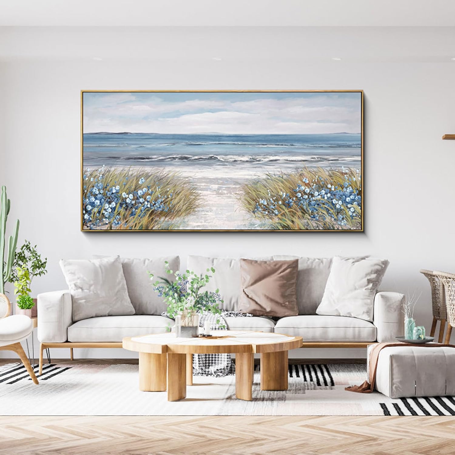 - Framed wall art for bedroom decor size :This vintage blue floral seascape picture artwork measures approximately 20x40 inches, and the view shown of the coastline and horizon is very wide and calming.