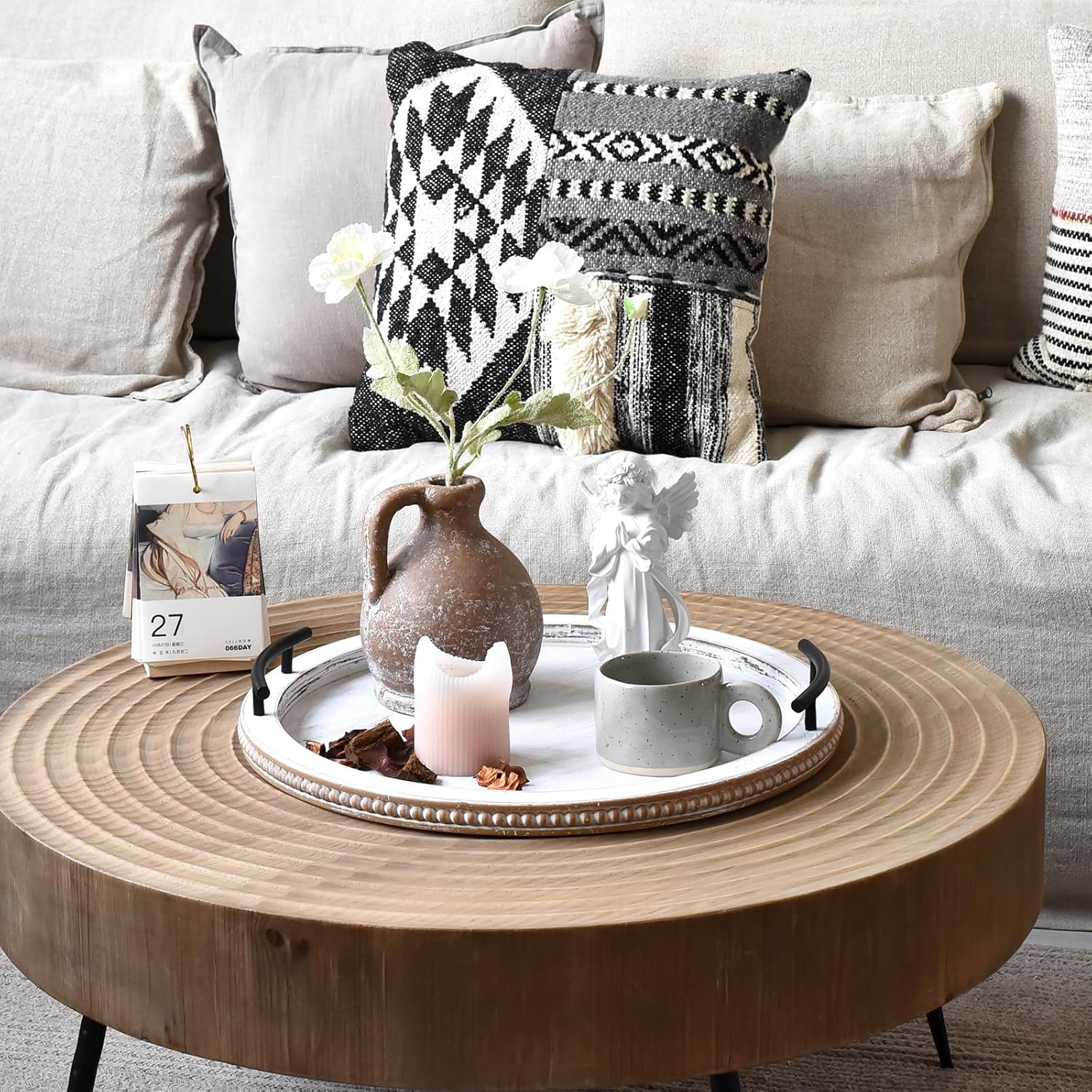 SwallowLiving 18Inch White Wooden Beaded Serving Tray with Handle Decorative Rustic Whitewashed Tray for Coffee Table Farmhouse Round Tray for Kitchen, Living Room and Bedroom