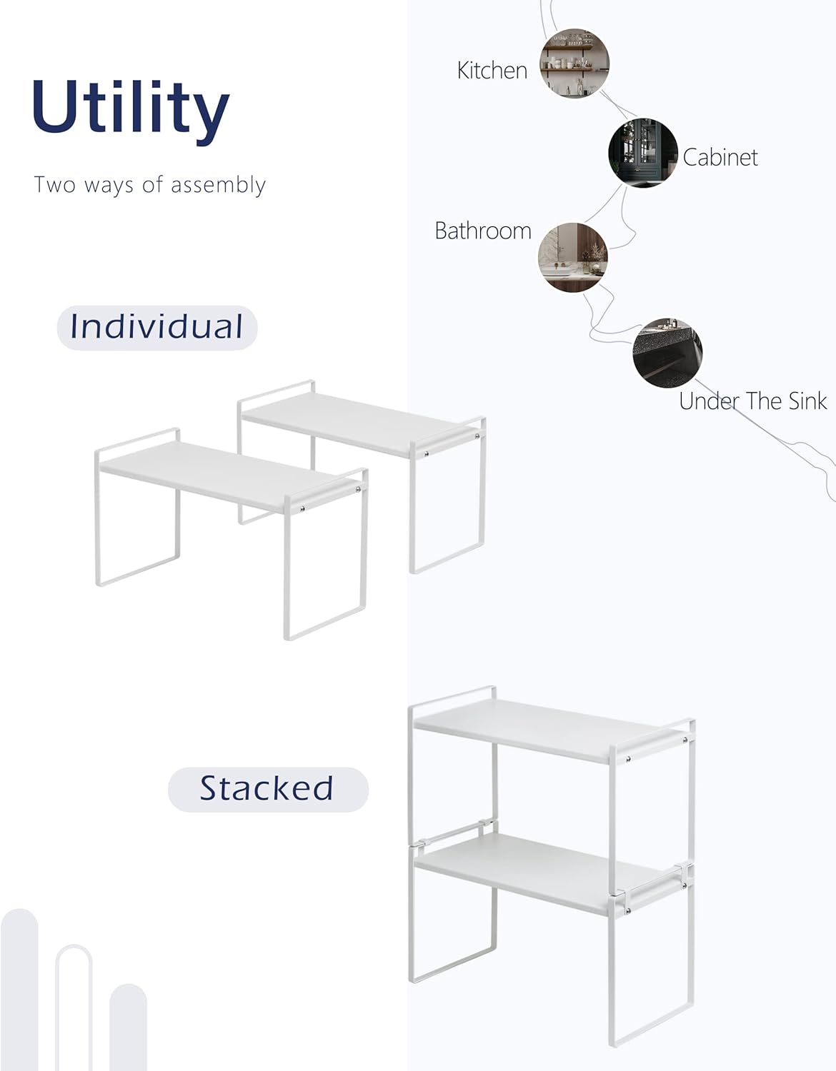 - STACKABLE: The product comes with two sets of cabinet shelves where you can stack one on top of another, creating 2-tiers double space to store household items under, in between or on the shelf. They are perfect to use as storage organizers in kitchen, cabinet, pantry, cupboard, and anywhere in your home or office for that wonderful extra storage space.