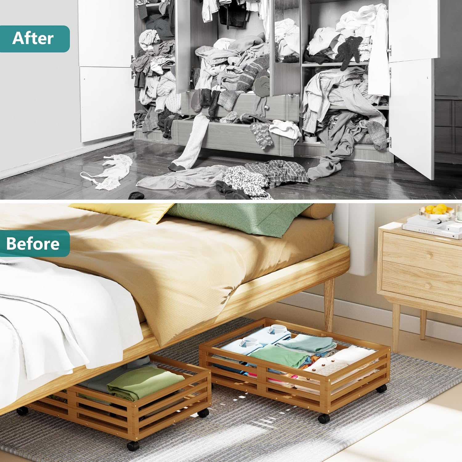 - π[Sturdy and Durable] Our under bed storage with wheels is crafted from premium wood bamboo, boasting 4 rotating wheels and a capacity of 120lbs. This 'under bed storage' solution includes non-woven bags for efficient organization of clothes, books, shoes, and toys.