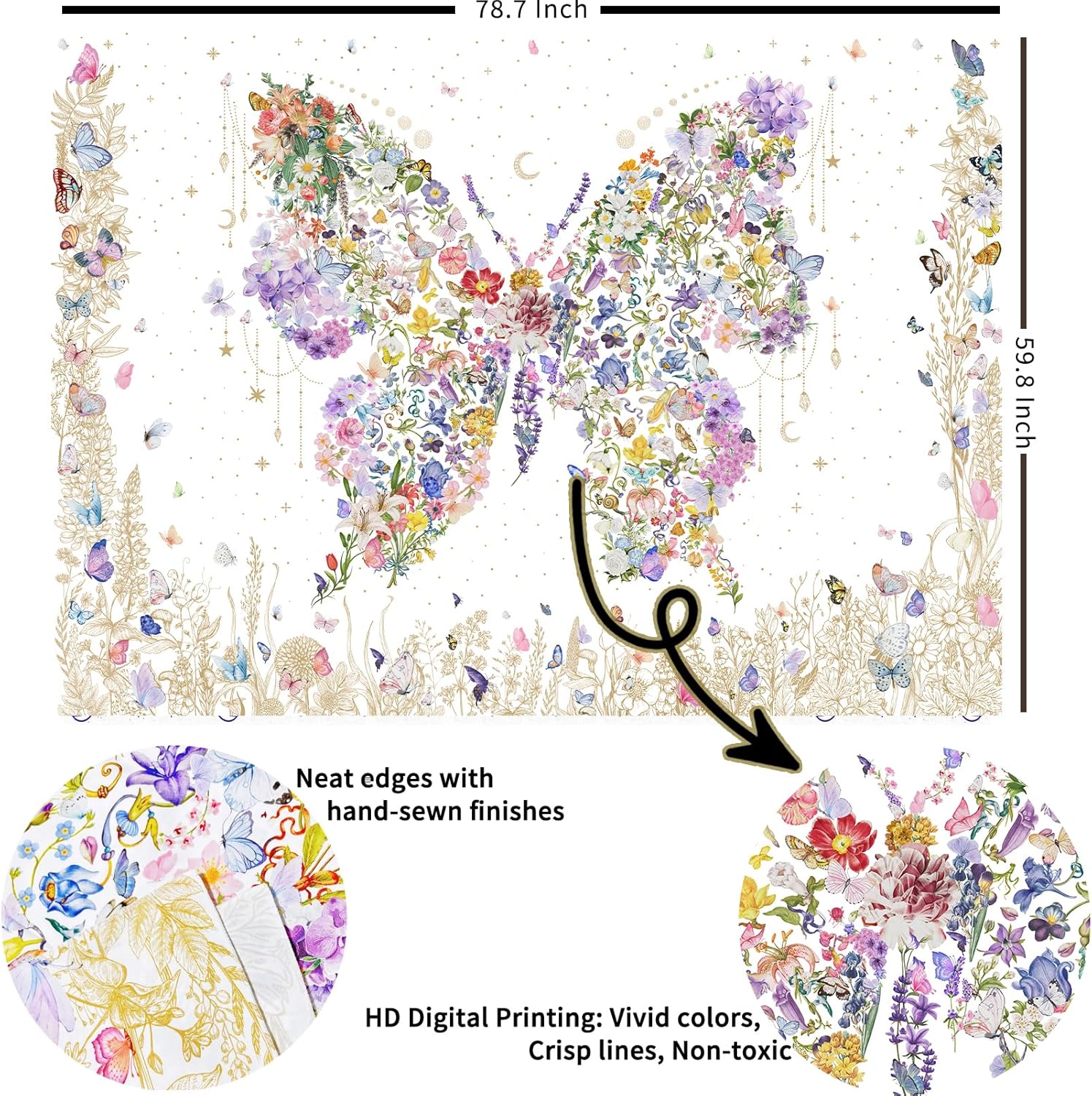 Damanse Butterfly Tapestry Wall Hanging Cute,Boho Wall Tapestry for Bedroom Aesthetic,Flower Living Room Decor for Teen Girls (White, 59.80" x 78.70")