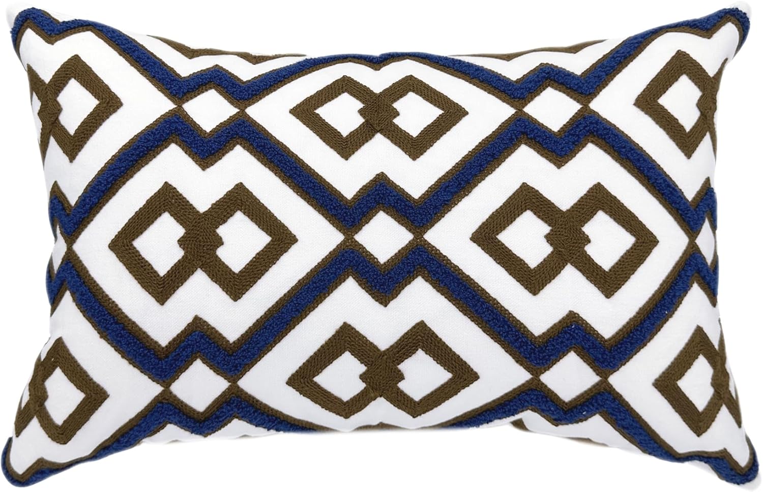 Alysheer Embroidered Lumbar Decorative Throw Pillow Cover 12"x 20", Classic Boho Geometric Embroidery Pattern Cotton Rectangular Cushion Case for Sofa Couch Living Room Bedroom(Blue Brown)