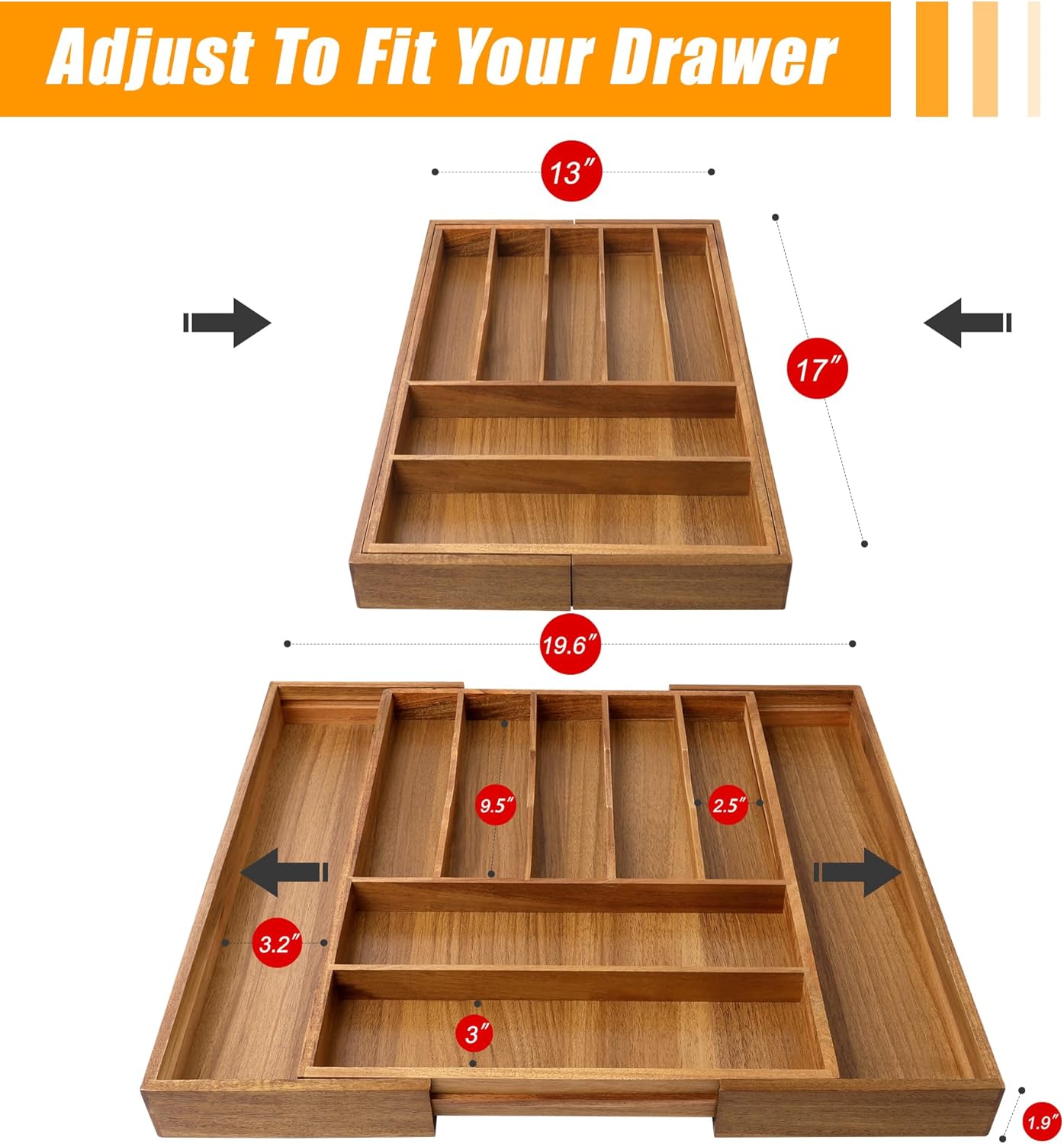 - â ăExpandable - fit most kitchen drawers.ăOur large utensil silverware drawer organizer flatware cutlery tray are adjustable in width, expanding from 17"x13" to 17"x19.6" as needed, with a depth of 1.9" . The utensil silverware drawer organizer is crafted from natural bamboo that has been grown for over 4 years. Each silverware drawer organizer made of bamboo is meticulously handcrafted by seasoned artisans to ensure a smooth, splinter-free surface. You can confidently allow your family or children to use our silverware drawer organizer.