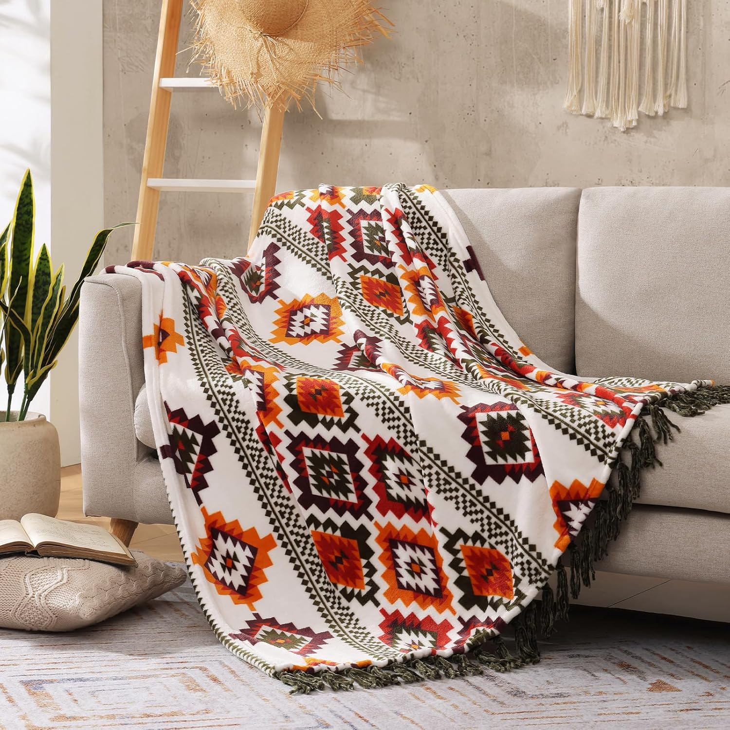CASAAGUSTO Boho Throw Blanket - Orange and Green Decorative Blankets with Tassel, Printed Flannel Bohemian Blanket for Chair, Bed, Sofa, Couch(50 * 60, Orange and Green)