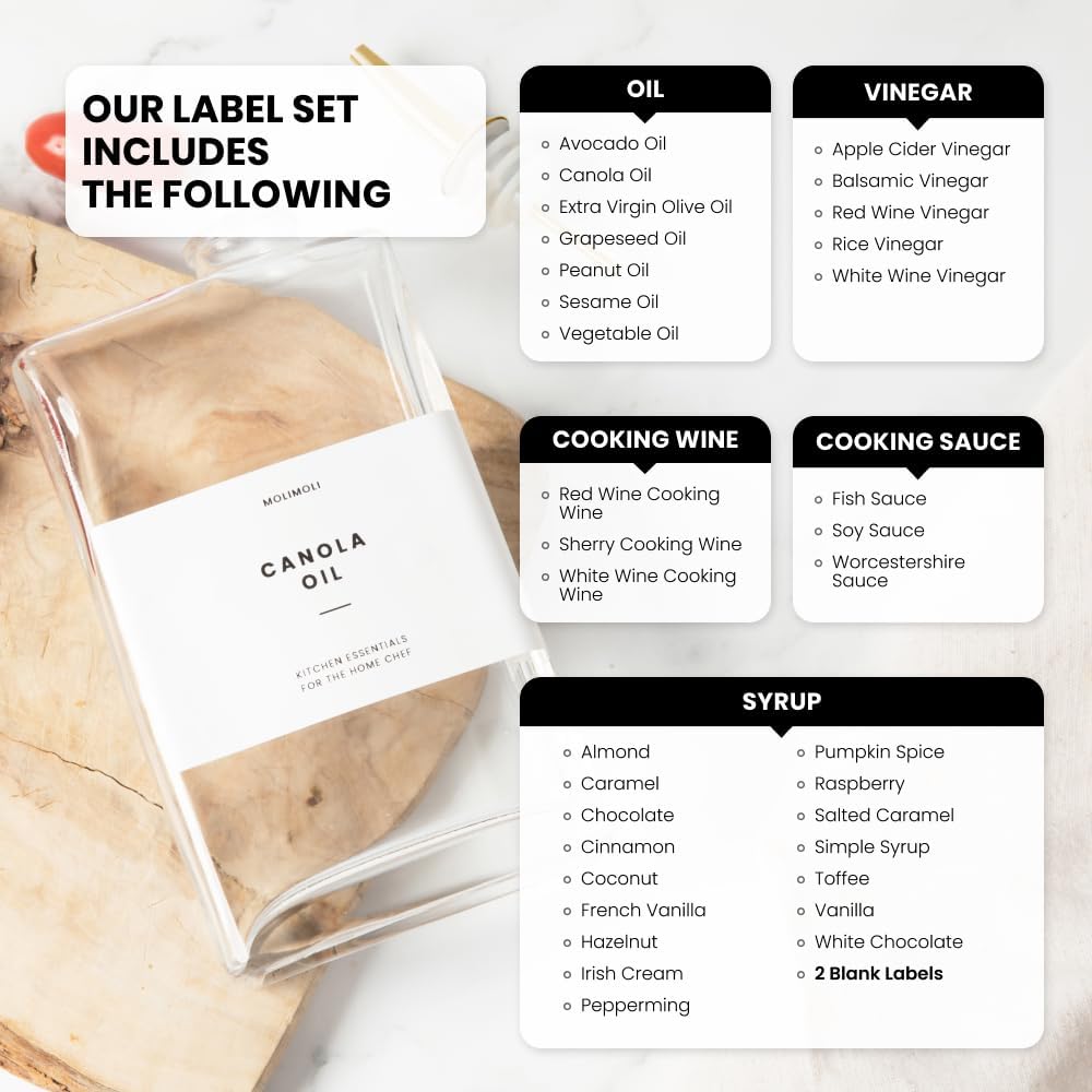 - Modern Kitchen Essential: Minimalism Inspired Cooking Oil Dispenser Bottle. This Set Includes Two High-quality 11.8 Oz (350 Ml) Glass Bottles, Two Gold Pourers, a funnel, and a 37 Label Set.