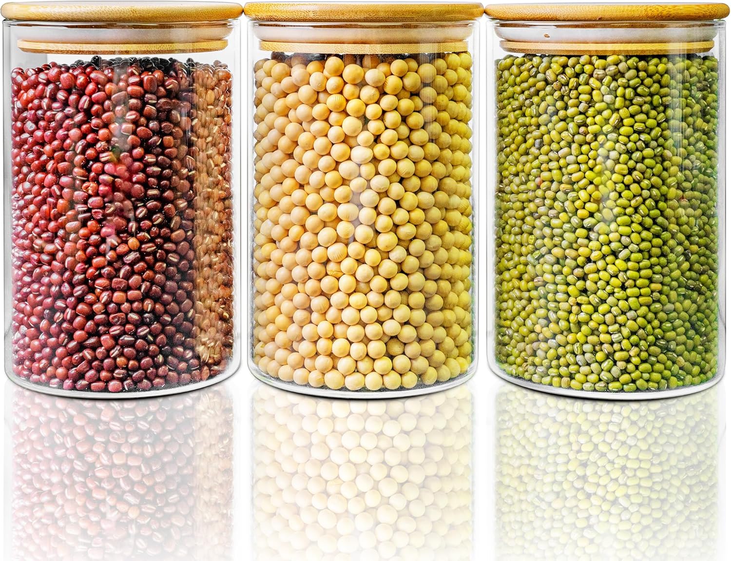 - [ Premium Glass Storage Containers with Lids Set of 3 ]: Premium glass jars with bamboo lids set have 3 pack 45 floz glass jars, and the size is 4.0 x 7.9 inch, great for pasta, coffee, oats, cereal, flour, sugar, rice, candy, cookies, nuts, teas, etc.The 45 oz glass jars with airtight lids are perfect to store food for maximum freshness and convenience in cabinet and pantry. With 4" wide mouth design, which can easily take out and refill with any type of foods