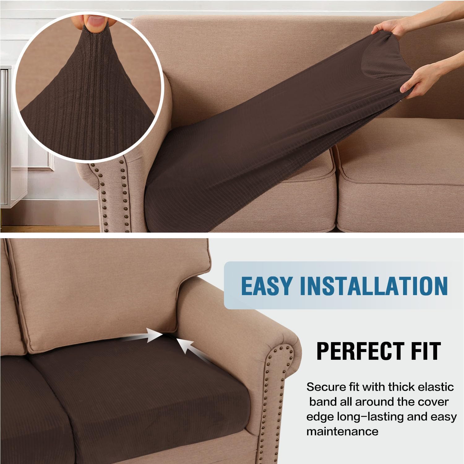 - STAY IN PLACE: Featuring non-skid thick elastic bottom, our cushion slipcover can stay tight with no snag, no wrinkling, shifting or slipping on both leather and cloth sofa. Check the installation guide carefully, it can be finished within 3 minutes by one person. It is very easy to put on and take down. (Installation Instructions Included)