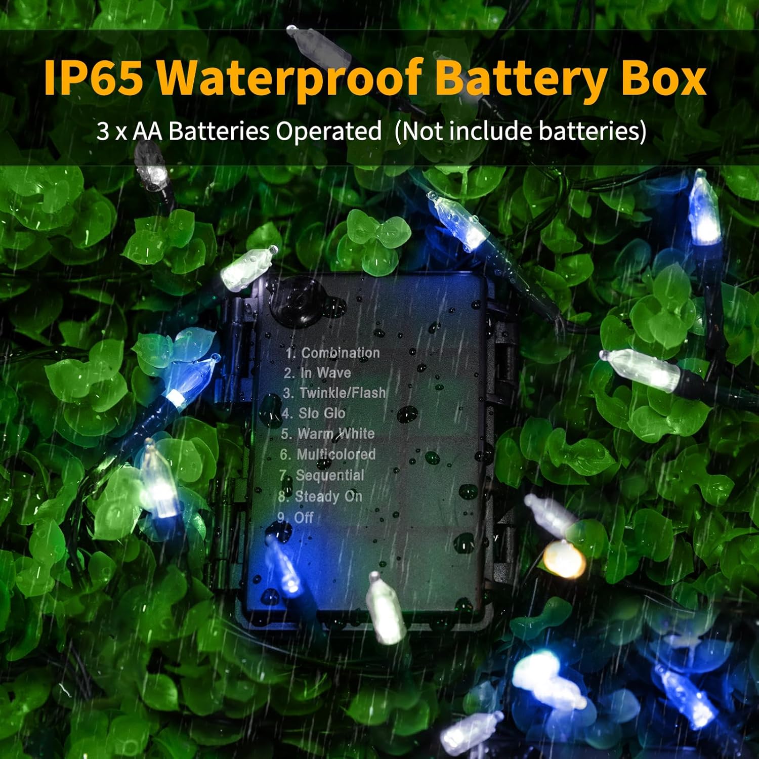 - 【Manual operation】There is 8 various fantastic lighting effects adapting to desired occasions or events: press the button on control box repeatedly to select 1.combination, 2.in wave, 3.sequential, 4.slow glow, 5.chasing or flash, 6.slow fade, 7.twinkle or flash or 8.steady on