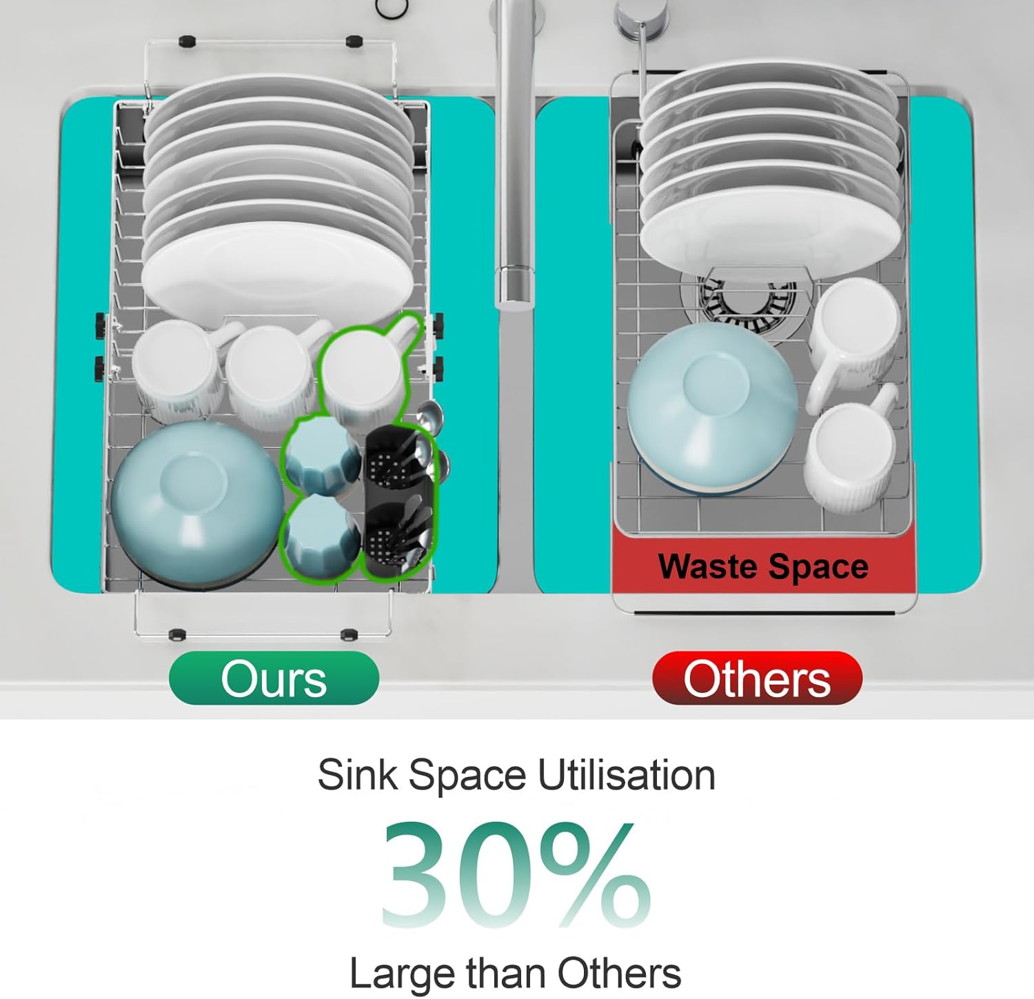 - Versatile and Long-lasting: Designed from stainless steel, the over the sink dish drainer drying rack offers longevity and rust-resistance. It accommodates multiple plates, cups, bowls, and cutlery. Its over-the-sink design saves counter space and allows water to drip directly into the sink, preventing water accumulation