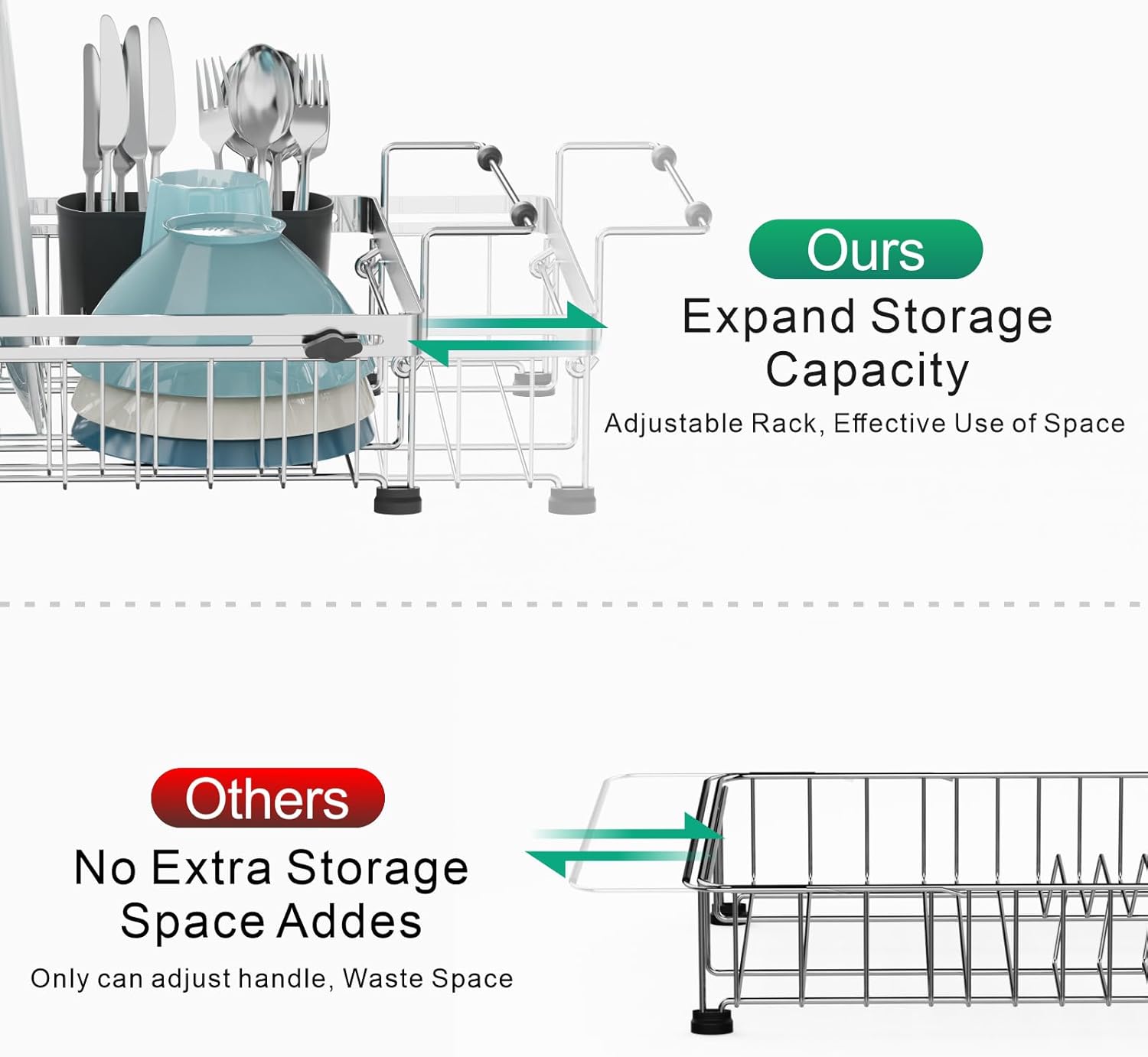 - Innovative "Adjustable Capacity" Design: Unlike other in sink dish drying rack that only allow for handle adjustments, ours can adjust the main body rack to increase 37% storage capacity. Product Size(not include handle length): (13.4~20.4)'' L x 12.8'' W(include bolts on both side) x 5.7'' H