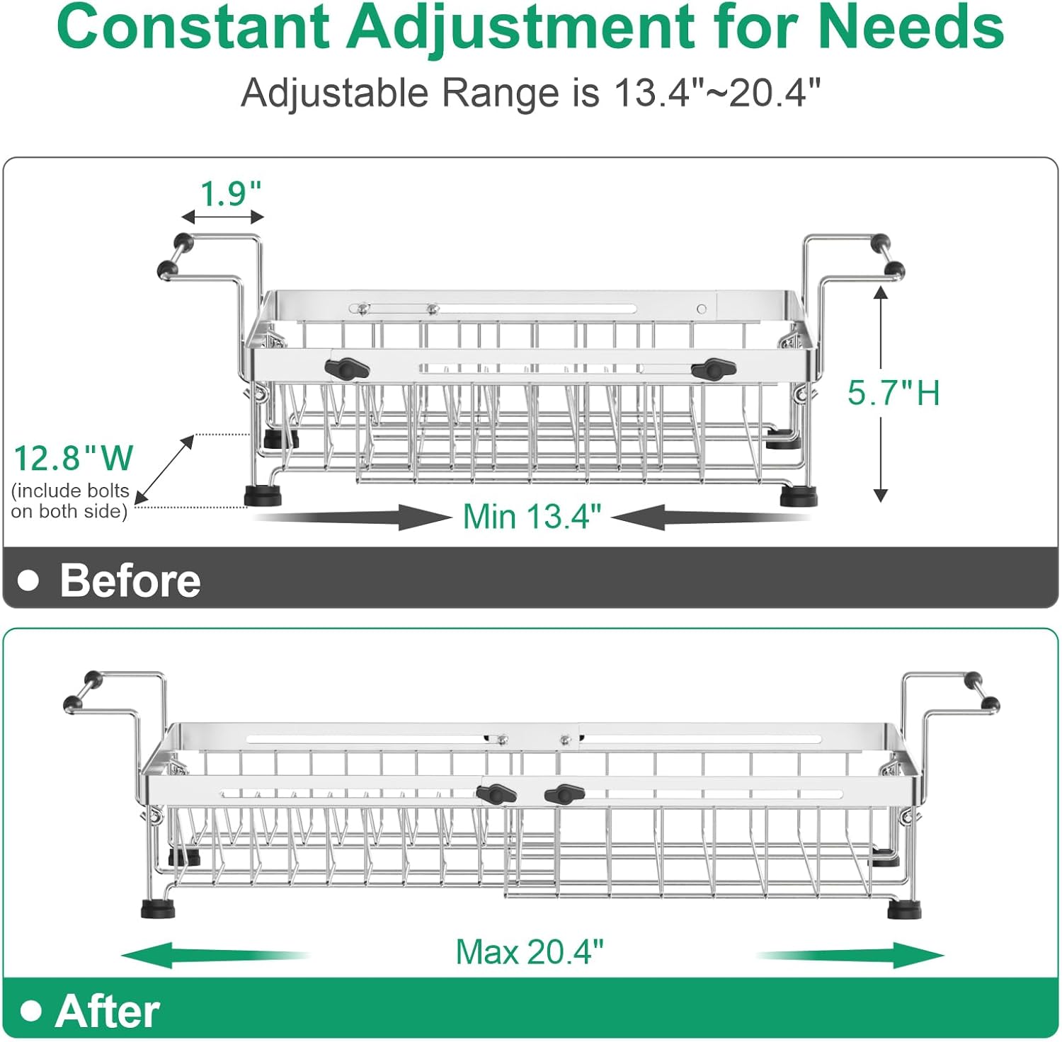 - Space-Saving 3-in-1 Dish Rack: Transform your small kitchen space with the GSlife expandable dish drying rack! Easily adjust the length (13.4" to 20.4" L) to perfectly fit in sink, over sink (up to 22"), or neatly on your countertop with drying mat. Ideal for apartments, dorms, or compact homes where every inch counts.