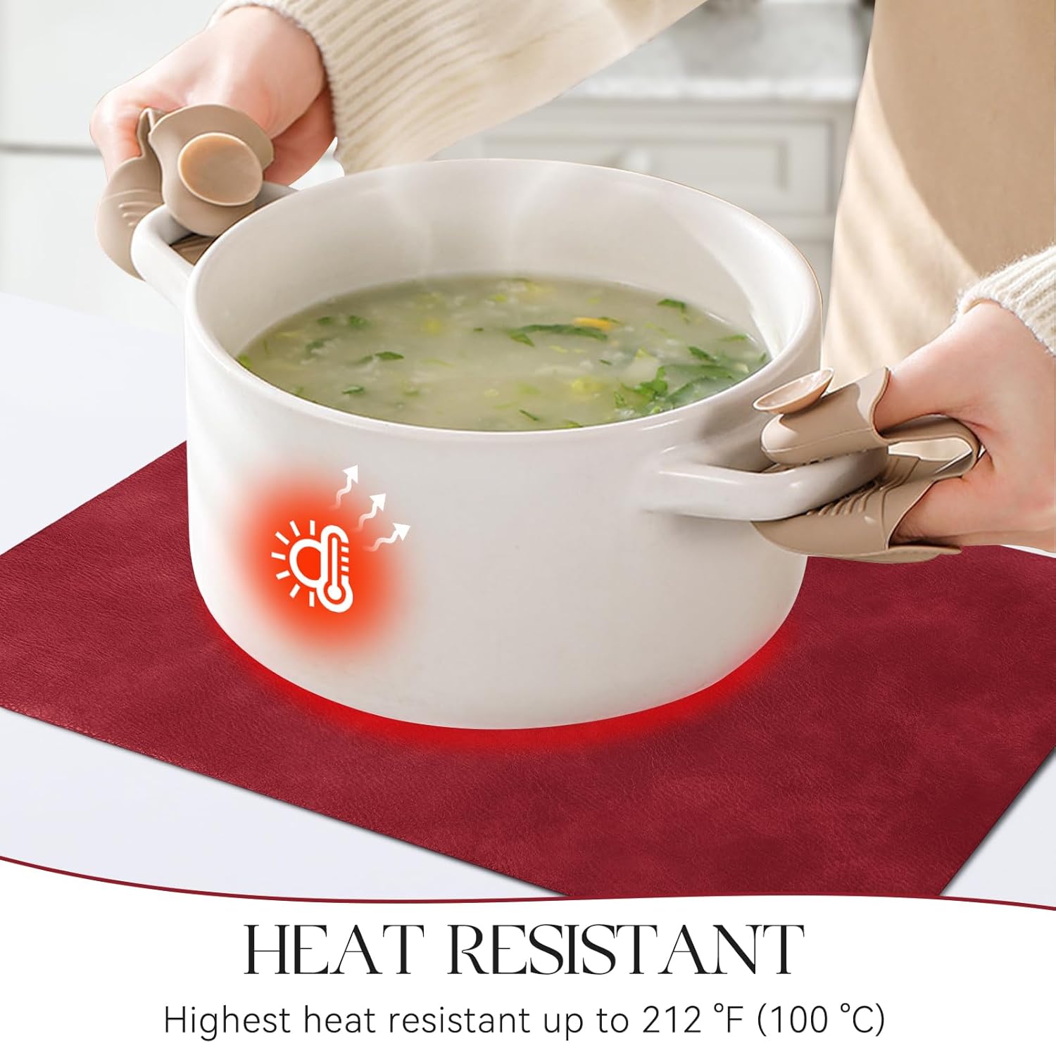- HASSLE-FREE CLEANING: Our faux leather placemats are designed to be 100% waterproof to better protect the table from grease and grime compared to woven and fabric placemats. If the placemats get stained with sauce or food residue, simply wipe with a cloth or rinse with water.