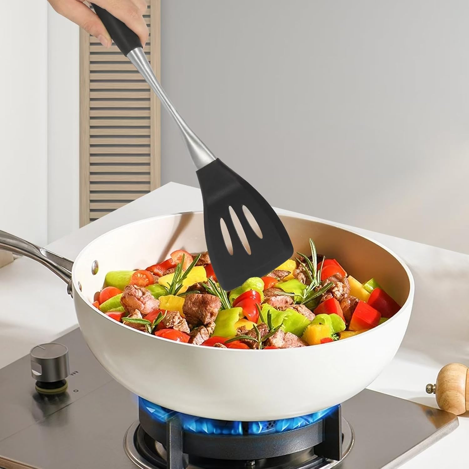Premium Black Silicone Cooking Utensils Set - Non-Toxic, Heat Resistant& Non-Stick Kitchen Utensils Set with Spatula, Spoon, Whisk, Tongs, BPA Free, Dishwasher Safe, Black