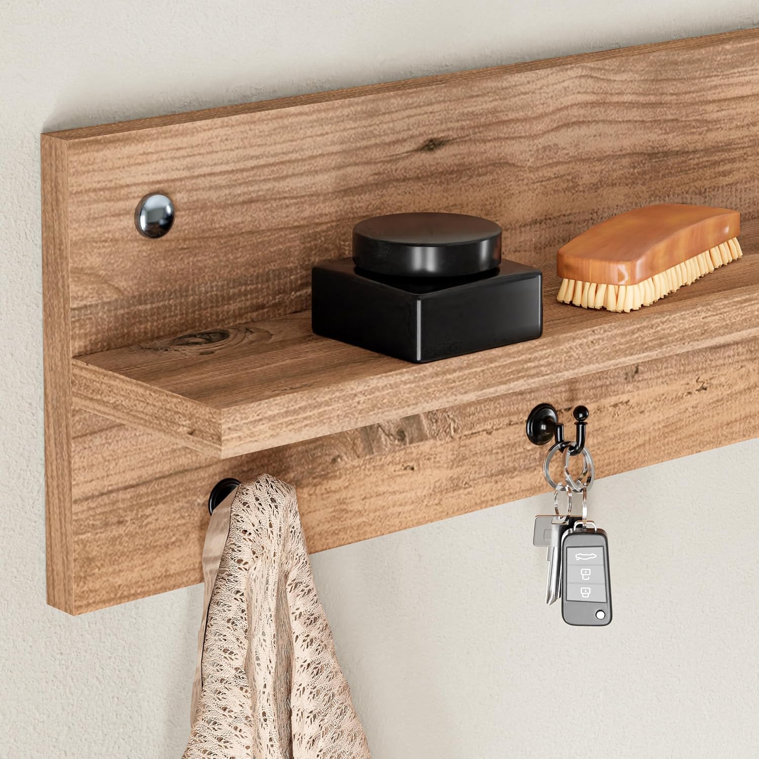 - All-in-One Organization: This versatile entrance organizer includes a shelf with hooks, providing ample space to neatly store hats, coats, keys, and more—keeping your entryway clutter-free.