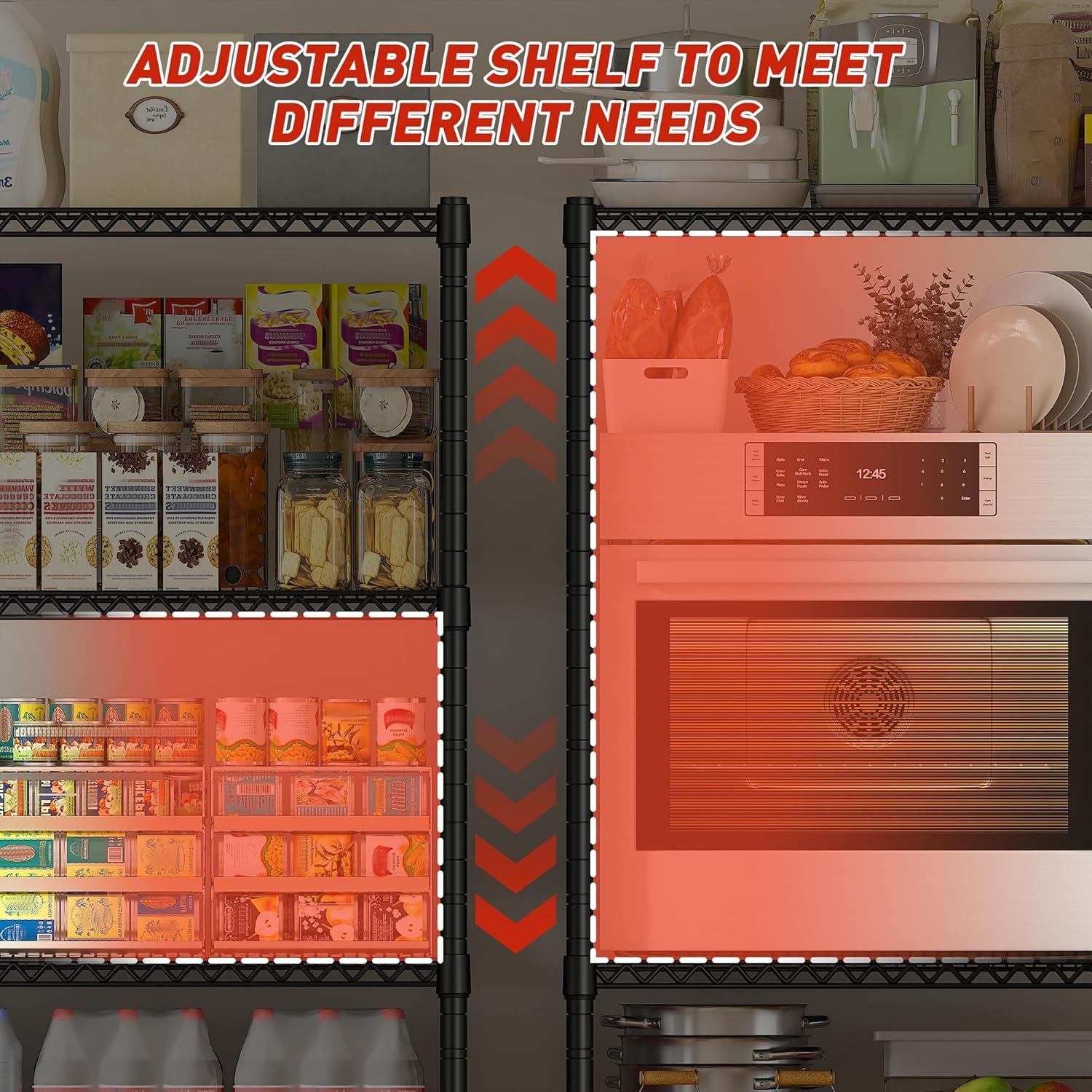 - 【60"W Metal Shelving Unit】The garage shelving measure 60"W x 18"D x 65.5"H. The capacity of the shelf is twice as much as the pantry shelves, easily meet your storage needs. Also perfect for various spaces such as garage, pantry room, kitchen, living room, office, warehouse, commercial exhibition, hotel, supermarket, etc.