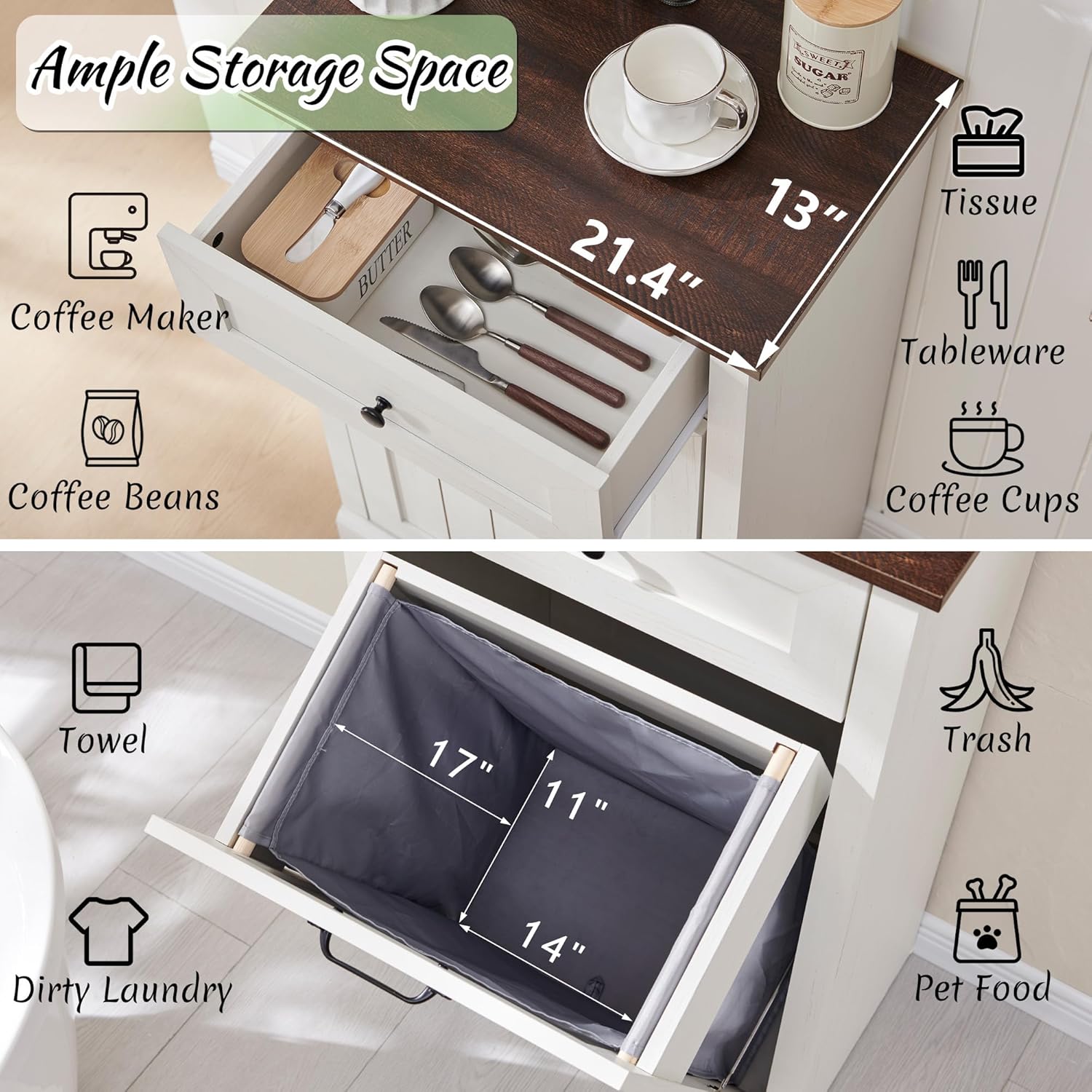 Tilt Out Laundry Hamper Cabinet, 10 Gallon Farmhouse Trash Can Cabinet with Drawer, Hidden Wood Garbage Can Bin Cabinet with Laundry Storage Basket for Bathroom, Kitchen, Antique White