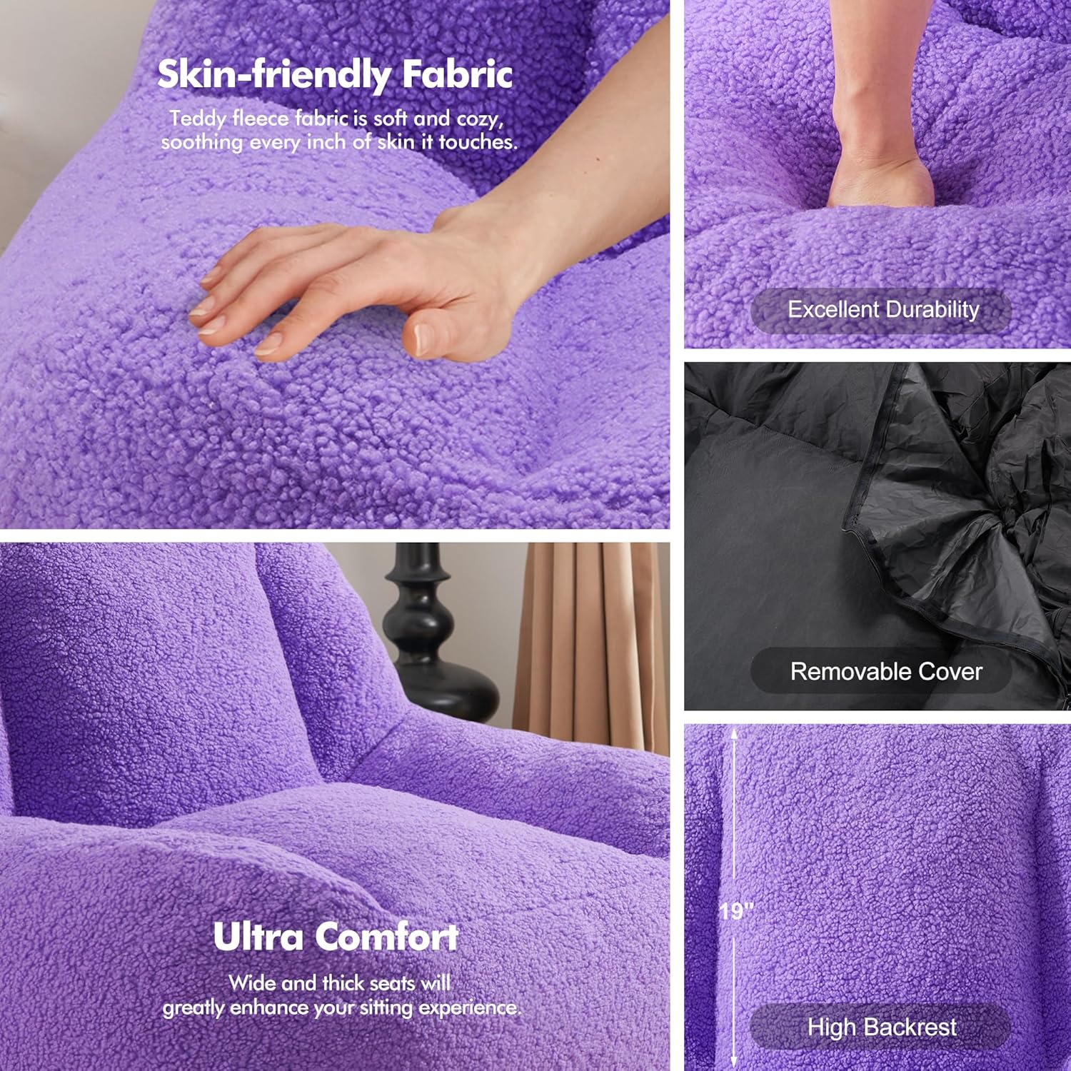 - User-friendly design: With two zippers on the bottom of the lazy sofa chair, the fluffy chair's cover can be removed for convenient cleaning and maintenance, ensuring the sofa remains aesthetically pleasing and hygienic for a long time. Non-slip fabric on the bottom of the sofa, which provides a stable and secure seating experience. Equipped with a handle, the bean bag chair sofa can be easily moved to desired locations within your home, allowing for flexible use in different areas.