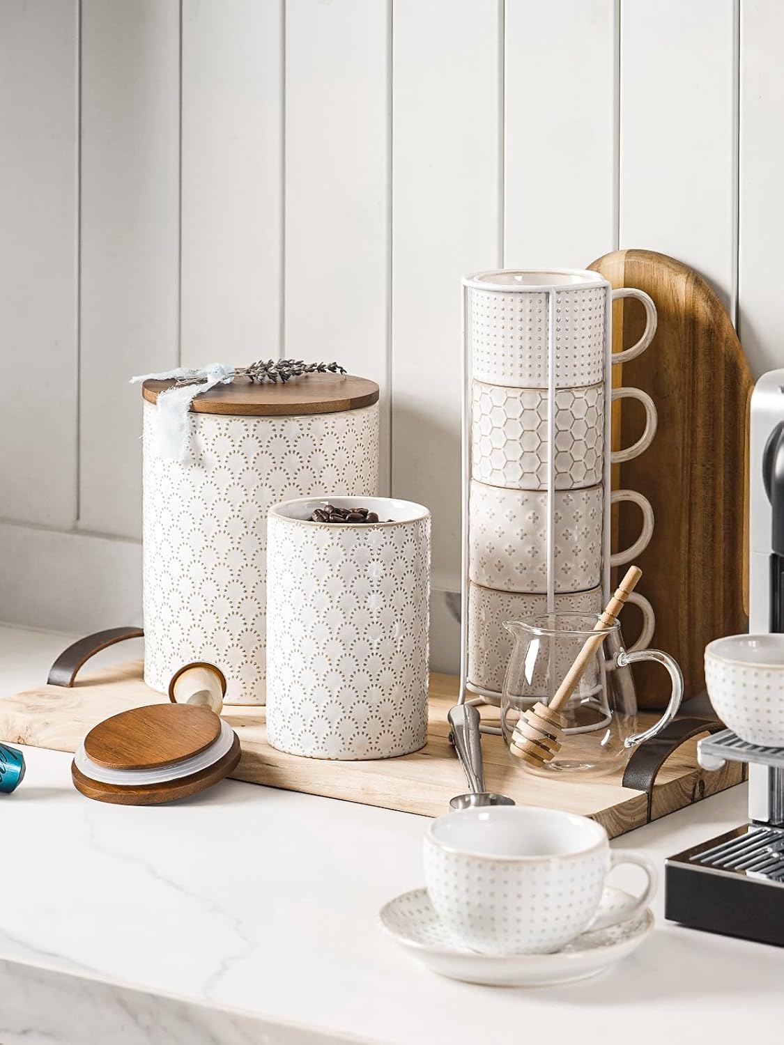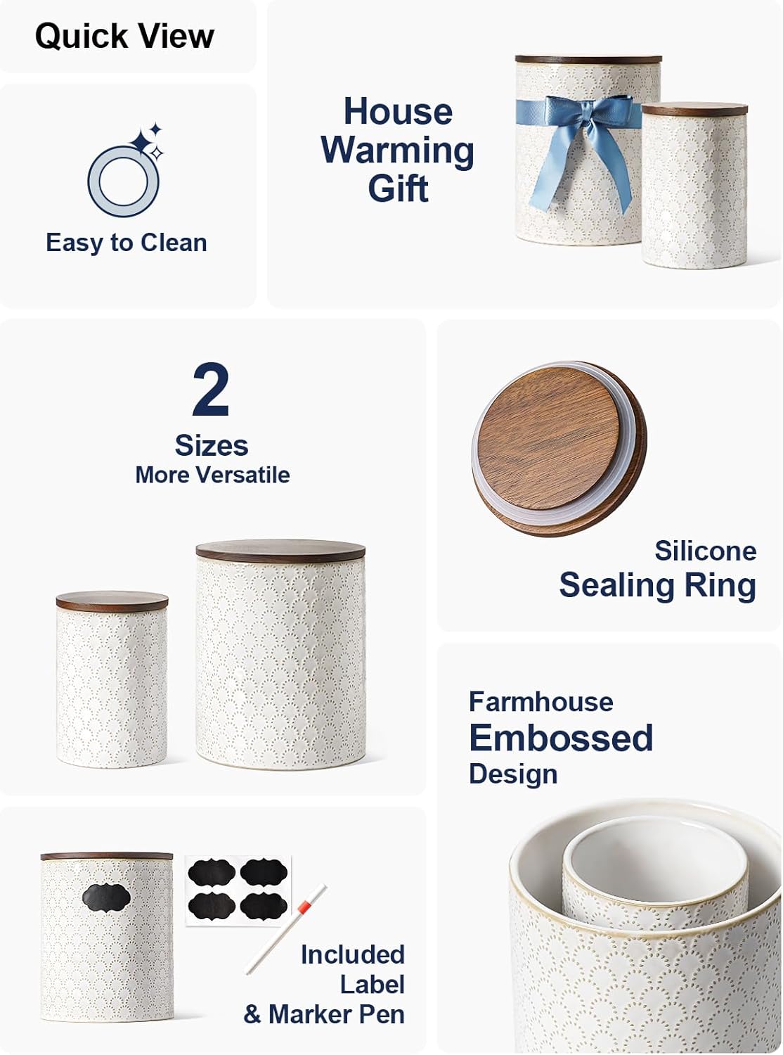 - Embossed Design: Featuring an arctic white glaze with a charming embossed pattern, these farmhouse-style ceramic jars will add warmth and vitality to your home. Their elegant design complements various home styles, making them the perfect addition to your countertop or coffee corner. Enhance your homeβs aesthetics and let these jars become a standout decorative element in your living space