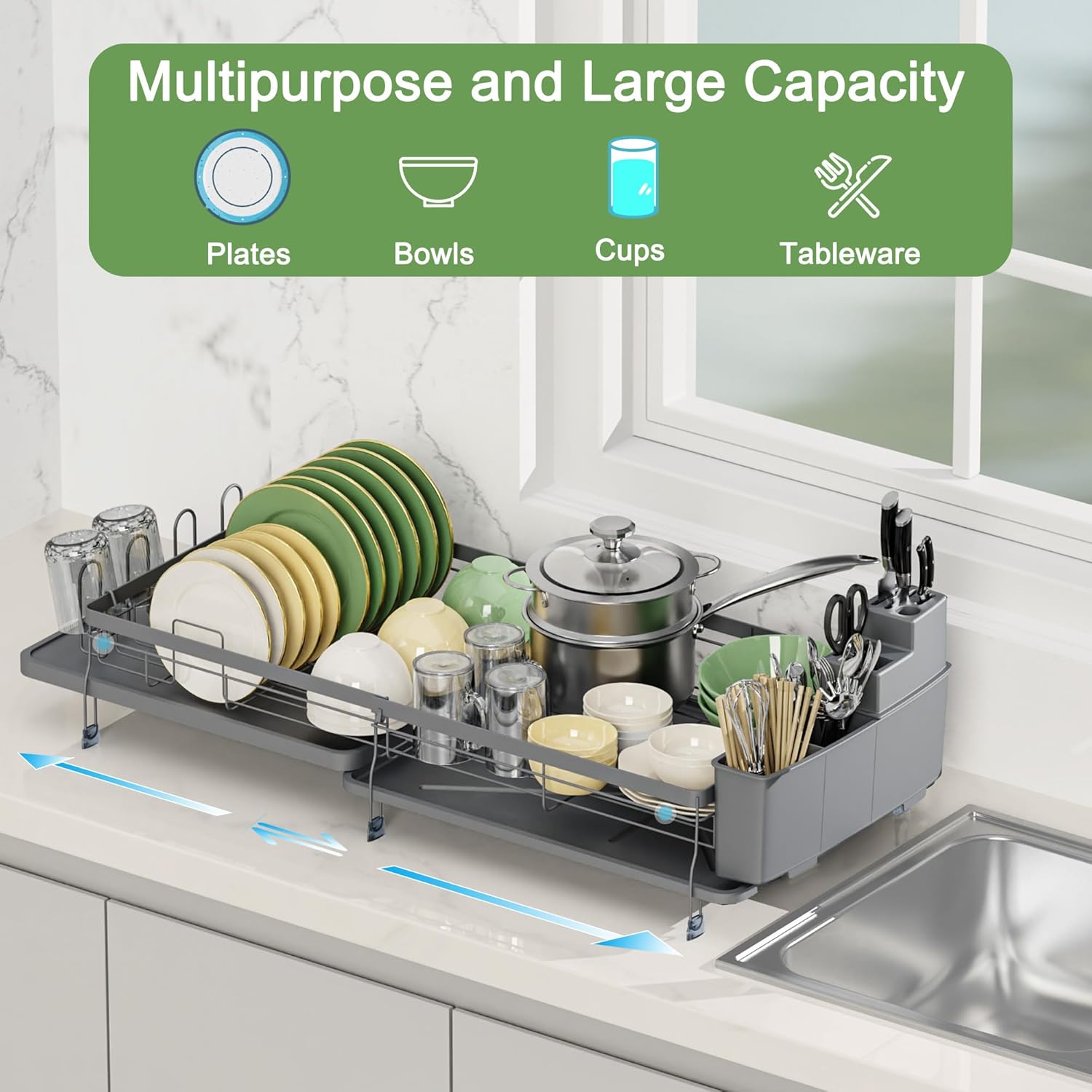 ROTTOGOON Expandable Dish Drying Rack,Multifunctional Adjustable Dish Drainer with Swivel Spout and Anti-Rust Dish Rack with Removable Cutlery & Cup Holders for Kitchen Counter,Dark Grey